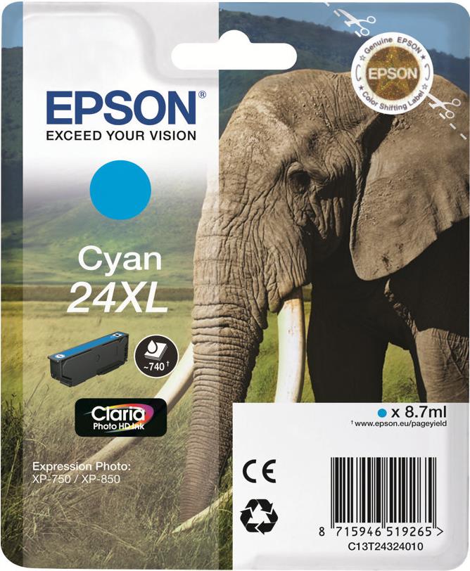 Epson 24XL - 8,7 ml - XL - Cyan - original - Blisterverpackung - Tintenpatrone - für Expression Photo XP-55, 750, 760, 850, 860, 950, 960; Expression Premium XP-750, 850 (C13T24324010)