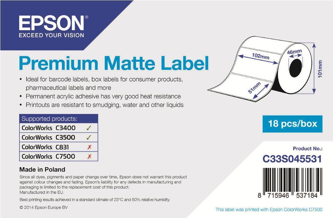 Epson Premium - Matte, gestanzte Etiketten - 102 x 51 mm 650 Etikett(en) (1 Rolle(n) x 650) - für Epson TM-C3400-LT; TM C3400, C3400 SecurColor, C3400BK, C3400E, C3400U, C3500 (C33S045531)