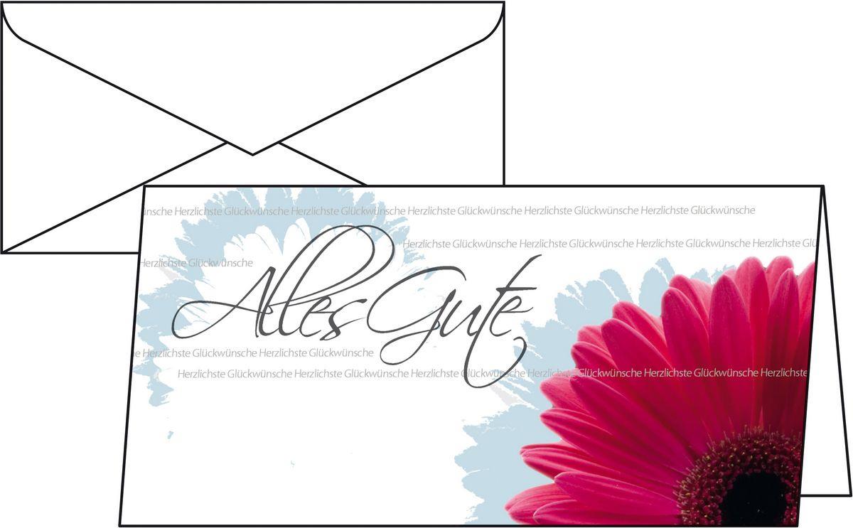Glückwunsch-Karten "Alles Gute" kombinieren ein Text-Designelement mit einer pinken Gerbera und sind flexibel einsetzbar. Die Karten sind zum Bedrucken mit InkJet- und ...