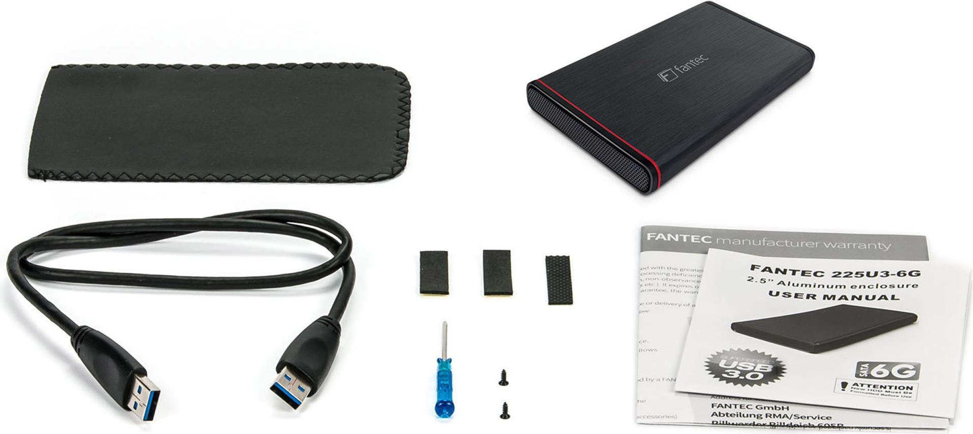 Das FANTEC 225U3-6G ist ein kompaktes Festplattengehäuse zum Einbau einer 6,35 cm (2,5 Zoll) SATA 1/2/3 Festplatte oder SSD, mit voller Unterstützung für SATA 3 / SATA 6G Festplatten (je nach verwendeter Festplatte deutlich höhere Geschwindigkeit beim Datenransfer, als bei normalen Gehäusen möglich!). Durch die einfache und schnelle Installation mit Plug & Play ist die Festplatte im Handumdrehen einsatzbereit. Für den Betrieb der Festplatte ist kein zusätzliches Netzteil notwendig. Die Stromversorgung erfolgt über die USB 3.0 Schnittstelle. Das Aluminiumgehäuse sorgt zudem für idealen Schutz Ihrer Daten bei mobilem Einsatz und passiver Kühlung der Festplatte.