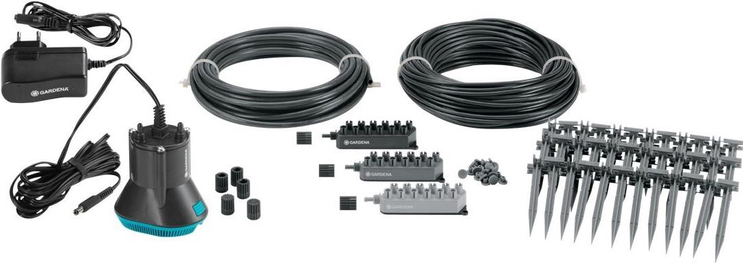 Netzteil, 3 Tropfverteiler ? 12 Ausgänge, Pumpe, 9 m Verteilerschlauch, 30 m Tropfschlauch, 36 Rohrhalter, 20 Verschlusskappen |