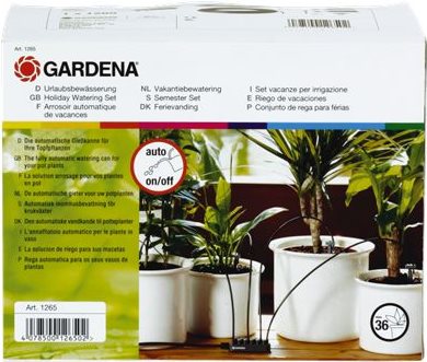 Mit der Gardena Urlaubsbewässerung können bis zu 36 Topfpflanzen automatisch bewässert werden. Auf diese Weise können Sie bequem Ihre Pflanzen ohne die Gießkanne bewässern - und Sie haben idealen Ersatz in Ihrer Abwesenheit. Über drei verschiedene Verteiler à 12 Ausgänge können diverse Wasserbedürfnisse bestimmten Pflanzen zugeordnet werden. Der gekapselte Niederspannungstransformator kann sowohl drinnen als auch draußen verwendet werden.