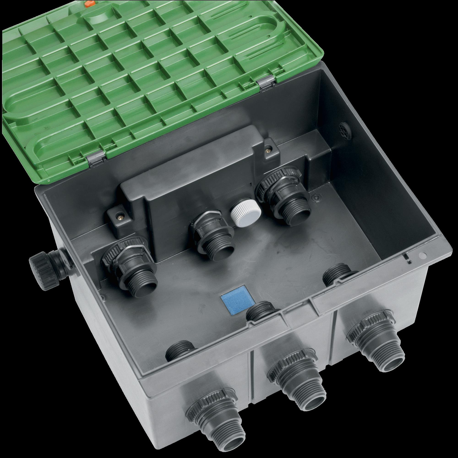 In der Gardena Ventilbox V3 können entweder drei Bewässerungsventile 24 V oder drei Bewässerungsventile 9 V unterirdisch eingebaut werden. Die Kabelanschlussbox ist wassergeschützt und sorgt für eine einfache und übersichtliche 24 V-Kabelverbindung.
