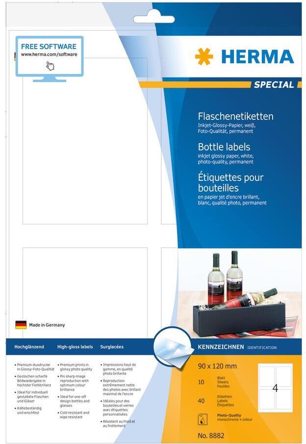 HERMA Special - Selbstklebende Flaschenetiketten, hochglänzend - weiß - 90 x 120 mm 40 Etikett(en) (10 Bogen x 4) (8882)