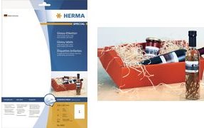 Flaschenetiketten aus Glossy-Hochglanzpapier auf A4-Blättern, selbstklebend. Hervorragende Inkjetdrucke in Schwarz und Farbe. Ideal für hochwertige farbintensive Etiketten für Wein- und Sektflaschen, Einmachgläser, Geschenke aus der Küche und vieles mehr. Das besonders hochwertige beschichtete Glossy-Papier garantiert exzellente Drucke in Premium-Foto-Qualität mit außerordentlicher Farbbrillanz, Konturenschärfe und Glanzeffekt. Sehr hohe Lichtbeständigkeit, schnell trocknend, hoch wischfest. Mit umlaufendem Rand: vollflächig bedruckbar und ideal auch für Inkjetdrucker mit kritischen Papierführungen. Kostenlose Softwarelösungen: www.herma.de/software.