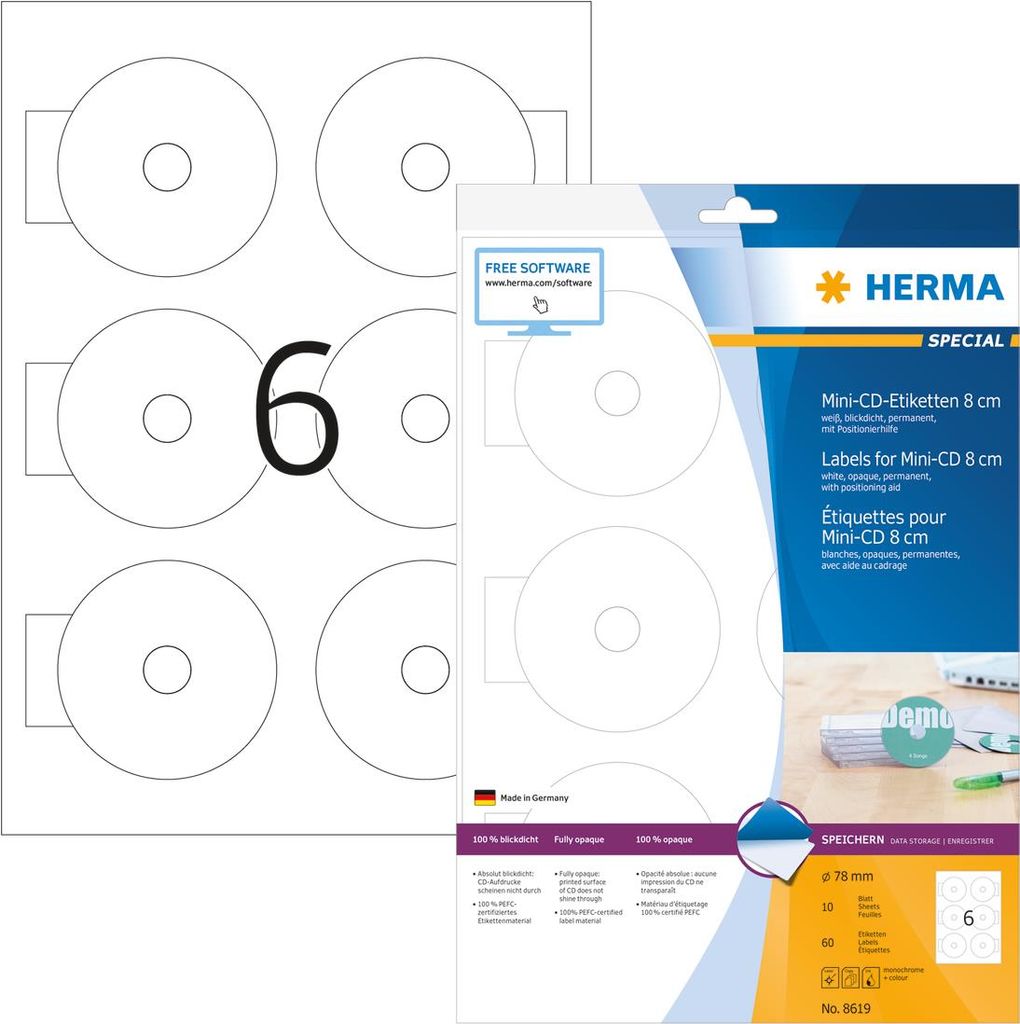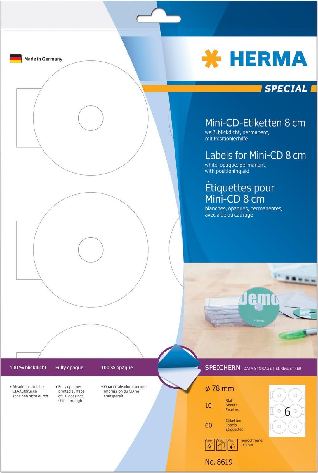 HERMA Special - Permanent selbstklebende, matte, lichtundurchlässige CD/DVD-Papieretiketten - weiß - 78 mm rund 60 Etikett(en) (10 Bogen x 6) (8619)