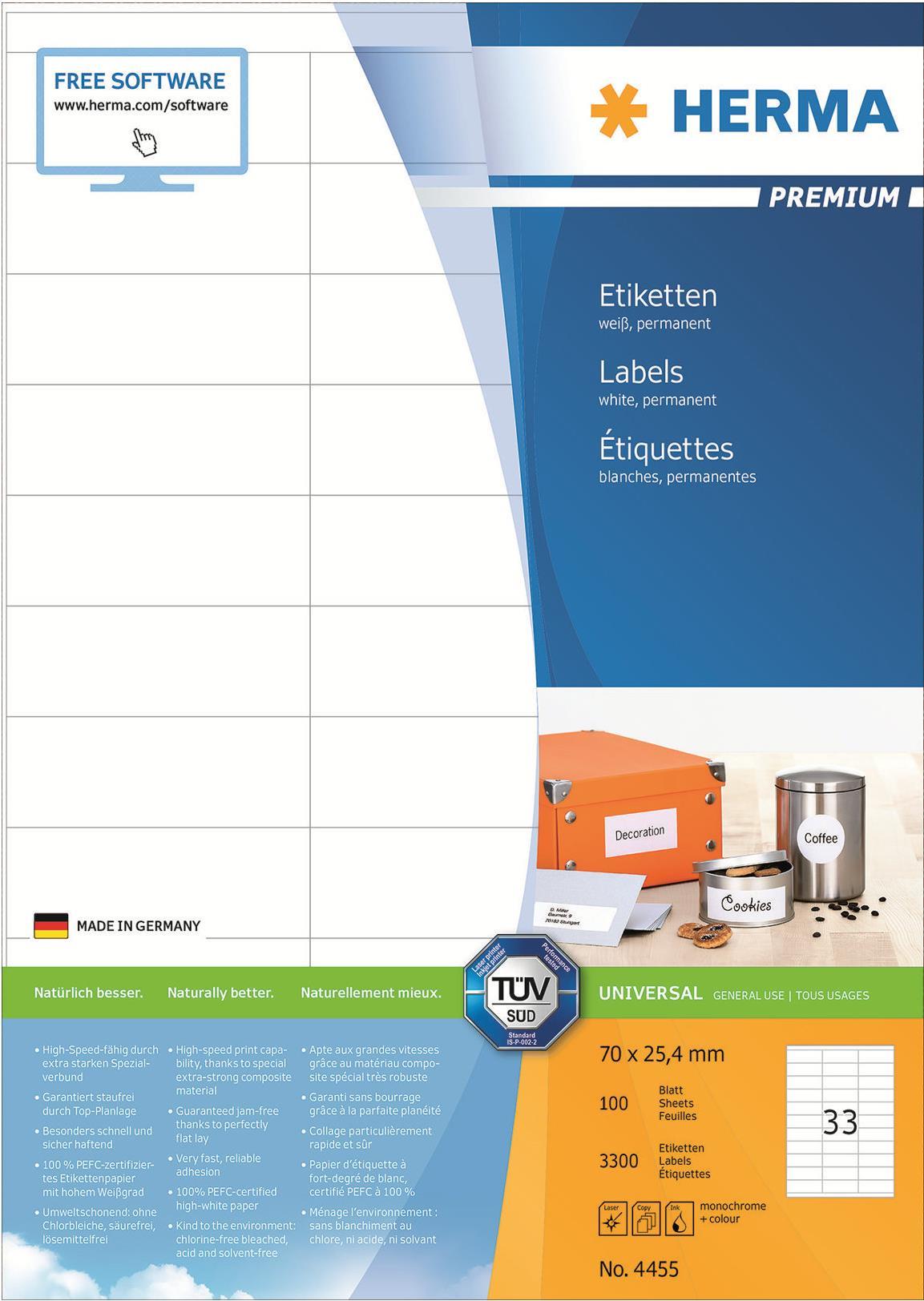 Selbstklebende Etiketten auf A4-Blättern, permanent haftend. Perfekt für alle Laser- und Inkjetdrucker, Kopierer, Farblaserdrucker und Farbkopierer. Garantiert staufrei und high-speed-fähig durch extra starken Spezialverbund, Top-Planlage und Rundum-Sicherheitskante. Problemloser Druckerdurchlauf für Laserdrucker und Inkjetdrucker getestet und bestätigt durch den TÜV SÜD. Hoher Weißgrad und gleichmäßige Oberfläche für beste Druckergebnisse in Schwarz und Farbe. Spürbar dicker: extra starke Etiketten - einfaches Aufkleben. Besonders schnell und sicher haftend, auch auf kühlen und feuchten Oberflächen. Umweltschonend und nachhaltig: chlorfrei gebleicht, PEFC-zertifiziert, lösemittelfreier Haftkleber. Etiketten sind 100 % recyclingfähig mit dem Altpapier, Verpackung aus Recyclingkarton. Kostenlose Softwarelösungen: www.herma.de/software.