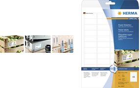 Extrem stark haftende Etiketten auf A4-Blättern, selbstklebend. Haften doppelt so stark wie herkömmliche Papieretiketten, auch auf kritischem Untergrund, z. B. feuchten, warmen, kalten, rauen oder staubigen Flächen. Ideal zur sicheren Kennzeichnung von Produkten, Dokumenten und Inventar, für Sicherheits- und Warnhinweise, für Rundbeklebung, als Prüfplakette oder Verschlussetikett, im Innenbereich. Umweltfreundlich: hochwertiges, chlorfrei gebleichtes Spezialpapier, PEFC-zertifiziert, lösemittelfreier Haftkleber. Etiketten sind 100 % recyclingfähig mit dem Altpapier, Verpackung aus Recyclingkarton. Sehr gute Druckergebnisse auf allen Laser- und Inkjetdruckern, Kopierern, Farblaserdruckern und Farbkopierern. Störungsfreie Verarbeitung durch Rundum-Sicherheitskante und optimale Planlage. Kostenlose Softwarelösungen: www.herma.de/software.