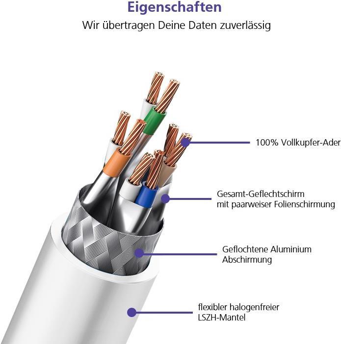 | Leistungsmerkmale | besonders schmaler Knickschutz (ideal bei hoher Packungsdichte) bis 10 Gbit geeignet für PoE (Power over Ethernet) geeignet Gesamtabschirmung Geflechtschirm Halogenfrei mit Längenangabe auf der Knickschutztülle Mit Rastnasenschutz Paare in Folie geschirmt |