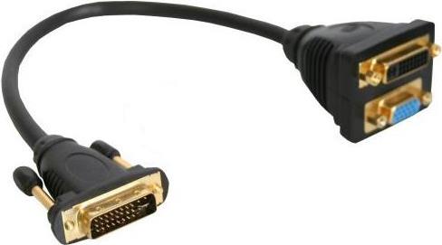 DVI-I Adapterkabel, DVI-I Stecker auf DVI-I-Buchse + S-VGA Buchse• Zum Verbinden von zwei Geräten mit einem DVI-I Anschluss• Kontakte vergoldet• DVI-I Stecker (24+5) an DVI-I Buchse (24+5) und S-VGA Buchse (15pin)