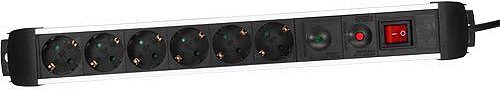 InLine® Steckdosenleiste, Alu, 6-fach mit Überlast- und Überspannungsschutz • Anschlüssse: 6x Schutzkontakt• Ausrichtung Anschlüsse: 45°• Anzahl Anschlüsse: 6• mit Montagelöchern• Stecker: Schutzkontakt gewinkelt• Kabel: H05VV-F3G1,5mm²• Eingangsspannung: 230V• max. Leistung: 3500W• Kabellänge: 1,5m• Mit erhöhtem Berührungsschutz• Farbe: schwarz/silber/matt• Schalter: beleuchteter Schalter• Material: Aluminium/Kunststoff• GS-Geprüft• Abmessungen: 495x60x52mm (LxBxH)