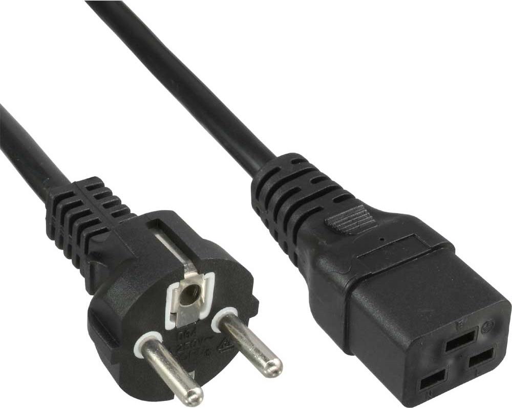 InLine® 2-poliges Netzkabel mit Schutzkontakt für den Anschluss von Computern, Monitoren, Druckern, Fernsehern und vielen anderen elektronischen Geräten im IT-Bereich an das 250-V-Netz mit IEC 60320 C-19-Stecker, der einen maximalen Strom von 16 A aufnehmen kann, wie er für High-Class-Server und USV-Anwendungen typisch ist.• Stecker (deutsch) CEE 7/7