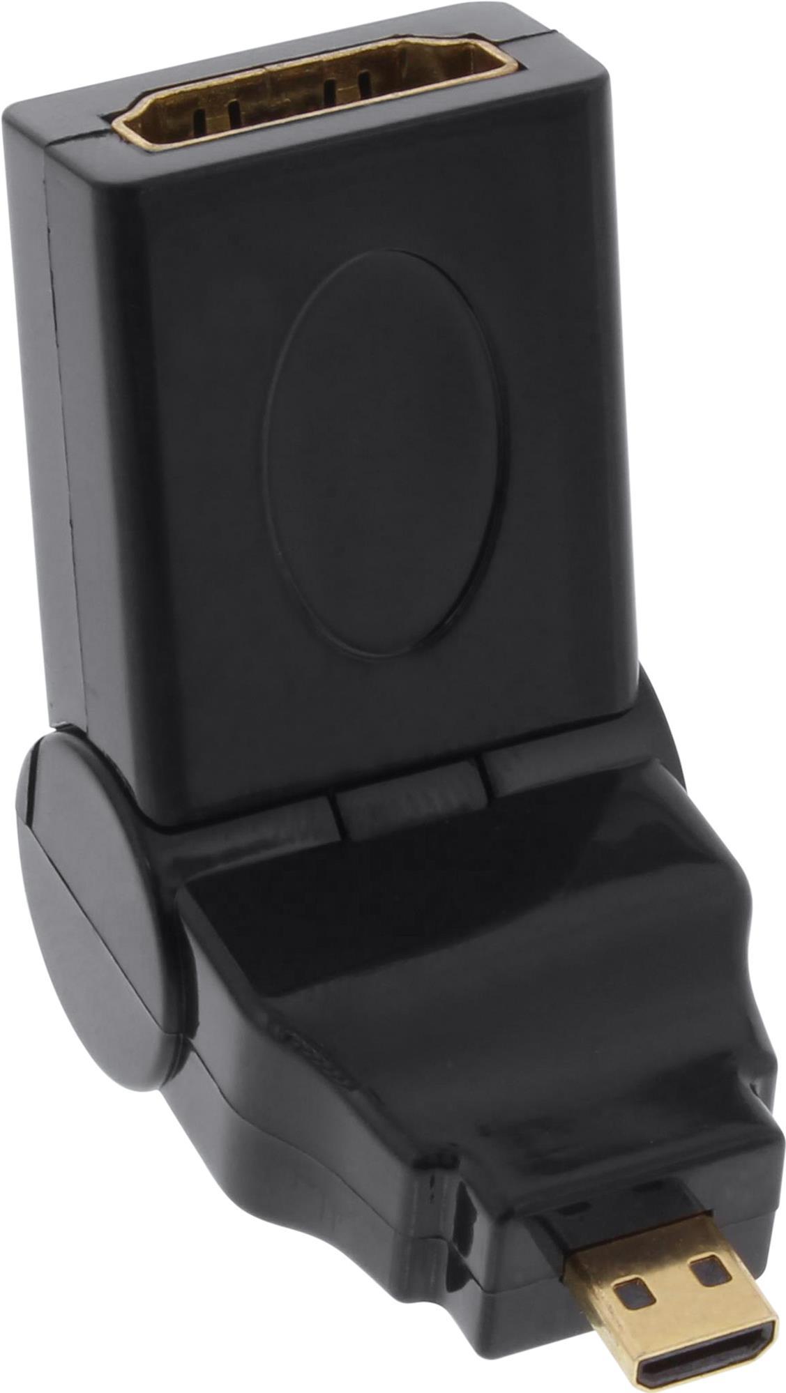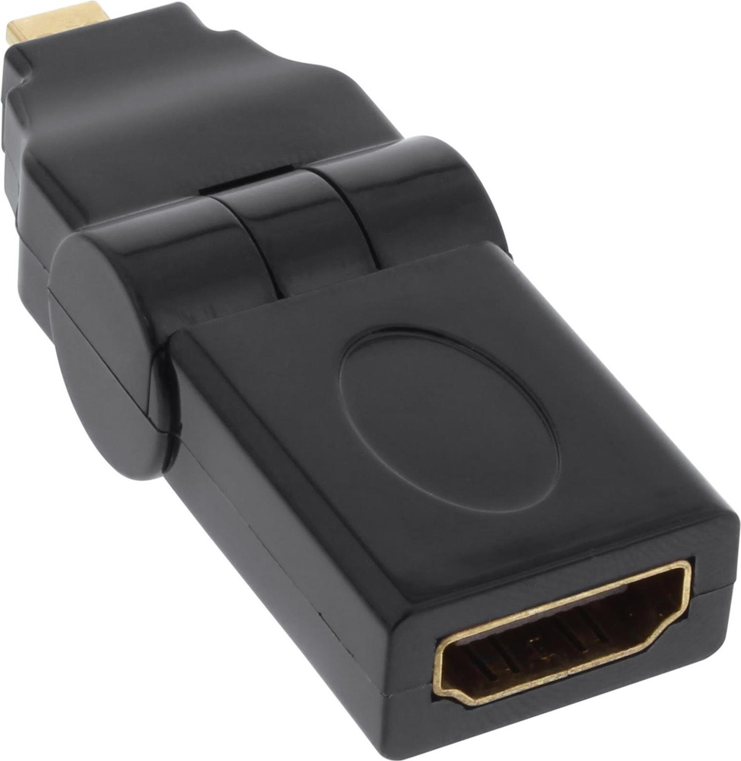 InLine® Adapter für den Anschluss eines Kabels mit HDMI-Anschluss an eine Quelle oder ein Peripheriegerät mit Micro-HDMI-Anschluss. Getestet auf einem Display mit 4K2K @30Mh Auflösungen, findet dieser Adapter auch Anwendung in Audio / Video (A/V) Systemen, Home Entertainment, Digital Signage, Digital Signage, professionellen und industriellen Videopostern oder Digital Signage in Umgebungen wie Konferenzräumen, Auditorien, Flughäfen, Stadien und mehr. Dieser spezielle HDMI-Adapter ist mittels eines mechanischen Gelenks um bis zu 180° schwenkbar und erleichtert so die Installation in Situationen, in denen der Abstand zwischen Fernseher oder Monitor und der Wand gering ist.• HDMI Adapter 19pin Typ-A Buchse auf Micro HDMI Typ-D Stecker