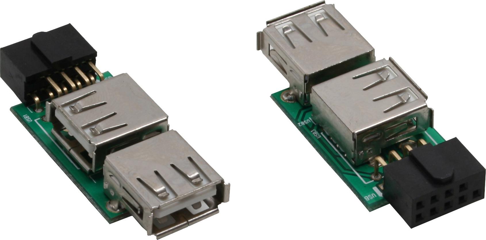 USB 2.0 Adapter, InLine®, 2x Buchse A auf Pfostenanschluss. Zum Anschluss von 1-2 internen USB Geräten mit externem USB Anschluss (wie z. B. Beispiel manche Frontpanel) direkt auf das Mainboard.• 2x USB A Buchse auf (Mainboard-) Pfostenanschluss 9pol.