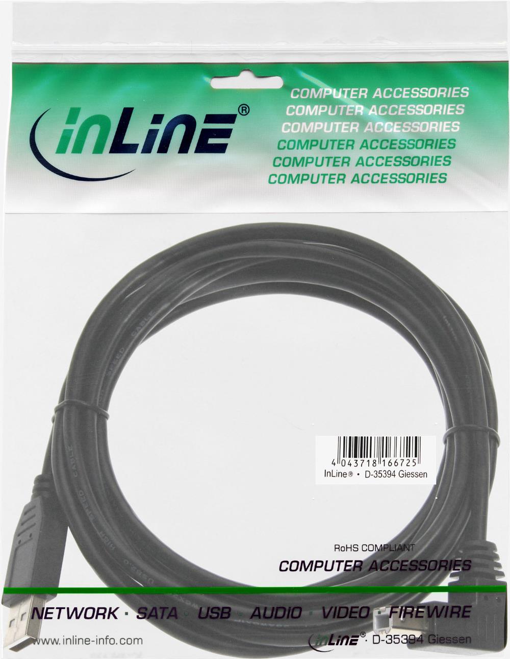 InLine® High Speed USB 2.0 ( Universal Serial Bus ) Kabel für die Datenübertragung mit einer maximalen Geschwindigkeit von 480Mbit/s. Dieses Kabel ist mit allen USB 2.0 und USB 1.1 und USB 1.0 Schnittstellengeräten kompatibel. Der um 90 Grad gebogene Typ-B-Stecker erleichtert die Installation in allen Situationen, in denen der Platz knapp ist.• USB Typ A Stecker auf USB Typ B Stecker