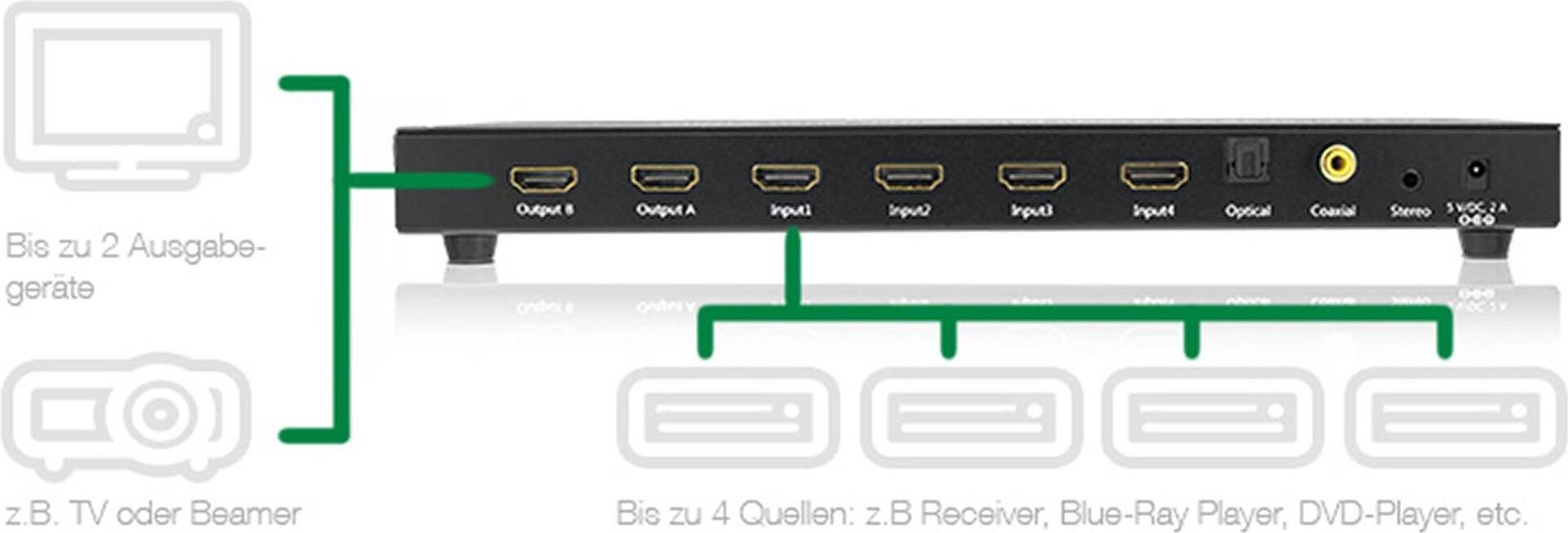 | Schnittstellen | 4 x HDMI-Eingang 2 x HDMI-Ausgang 1 x TOSLINK-Eingang 1 x Audioeingang Mini-Klinkenstecker 1 x digitaler Audio-Eingang (koaxial) RCA |