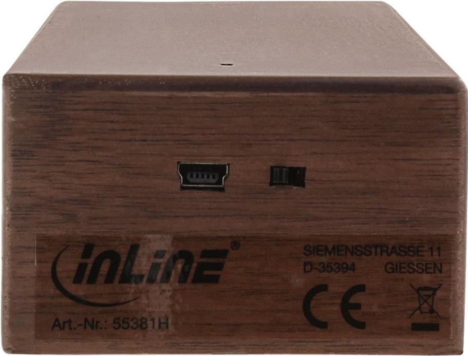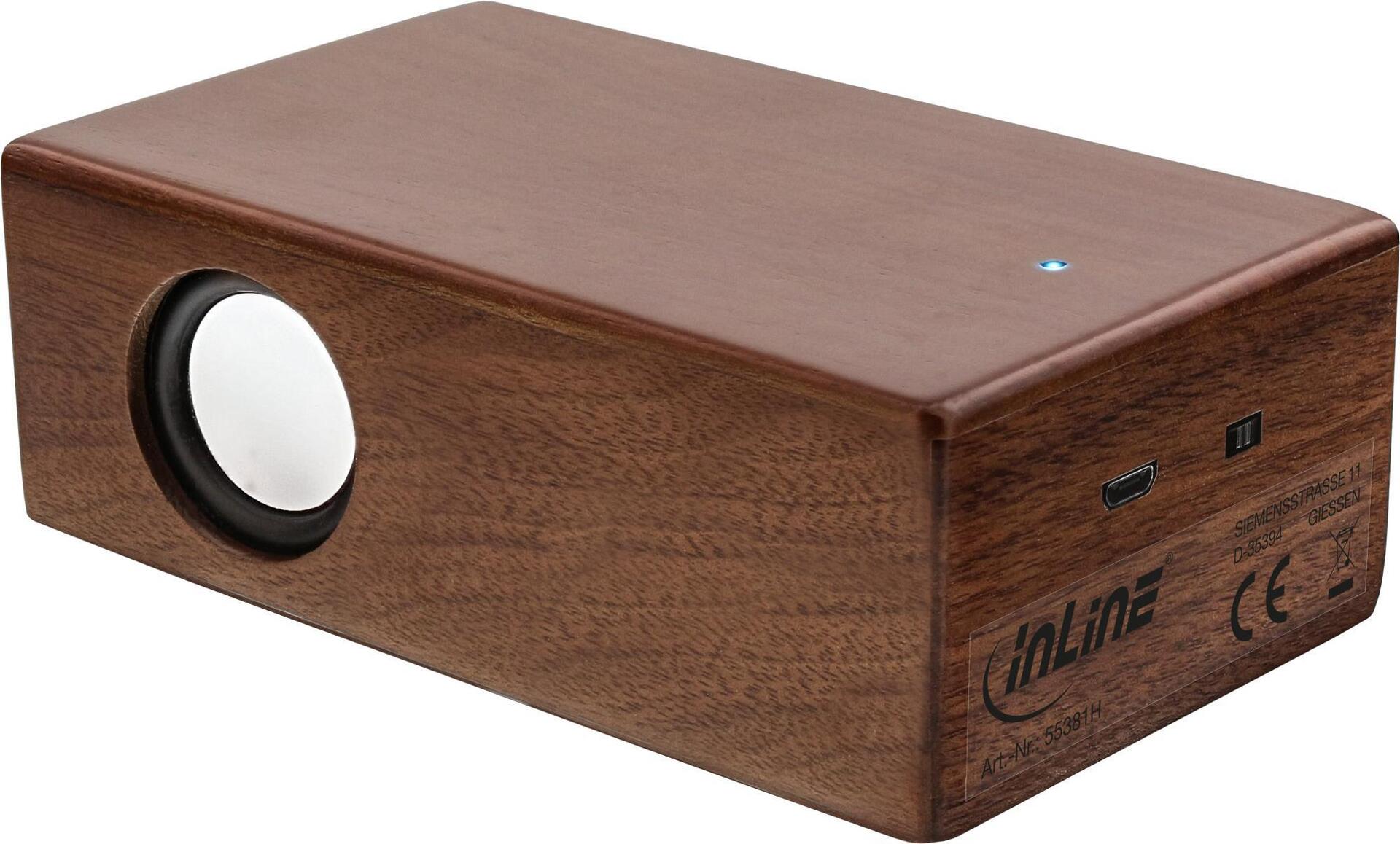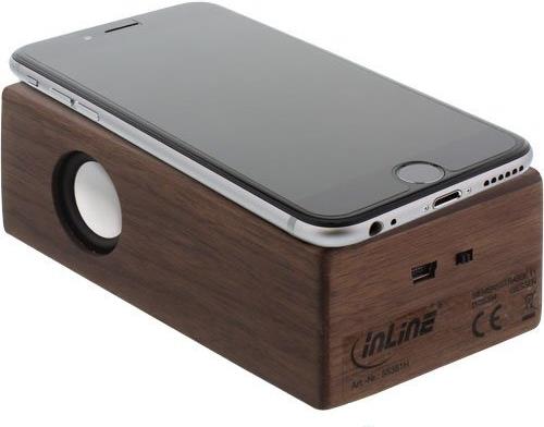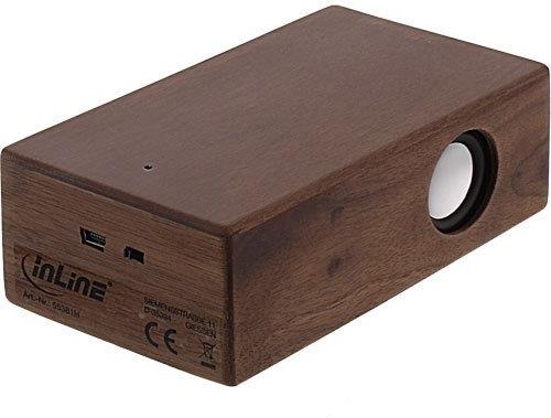 Dank modernster Induktionstechnik erleben Sie mit dem InLine woodbrick Musikgenuss ganz ohne Bluetooth oder WLAN. Die Audiosignale werden entweder über die Induktionsflächen erfasst, verstärkt und über den internen Lautsprecher wiedergegeben oder über das mitgelieferte Micro-USB Kombi-Kabel per Klinke verbunden, um die Musik wiederzugeben. Wir empfehlen den Gebrauch der Induktionsfläche ohne Handyschale. • 32mm Lautsprecher, 3W• Frequenz: 300Hz - 15kHz• Impedanz: 4Ohm• Li-Ionen-Akku: 800mAh• Eingangsspannung: +5 V• 6-8h Spieldauer• Ladedauer: ca. 3h• Micro-USB Port zum Laden und Audioeingang per Klinke• Echtholzgehäuse, 5mm stark• Abmessungen: 120x70x40 mm (LxBxH)• Gewicht: 150g• inkl. Micro-USB Kombi-Kabel USB A Stecker auf Micro-USB Stecker + 3,5mm Stereo Audiostecker InLine stellt in seiner Produkt-Reihe \"woodline\" Gadgets mit Körpern oder Details aus Echtholz vor. Die Bluetooth- / Induktionslautsprecher, Powerbanks, Stylus oder Kopfhörer mit liebevollen Applikationen aus echtem Walnussholz sehen attraktiv aus und fühlen sich gut an für Hand und Ohr.Hauptmerkmale