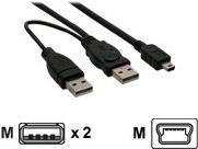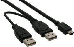 USB Mini-Y-Kabel, 2x Stecker A an Mini-B Stecker (5pol.), zum Anschluss von 2,5" Festplatten-Gehäusen mit Stromversorgung über den Mini-USB Anschluss. Einige externe Festplatten benötigen mehr Strom als der USB Port liefern kann. Mit diesem Kabel wird über den 2. USB Stecker zusätzlich Strom freigegeben. Die externe Festplatte muss allerdings für eine solche Stromversorgung konzipiert sein, d. h. das Kabel dient überwiegend als Ersatzkabel.
