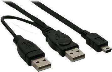 USB Mini-Y-Kabel, 2x Stecker A an Mini-B Stecker (5pol.), zum Anschluss von 2,5" Festplatten-Gehäusen mit Stromversorgung über den Mini-USB Anschluss. Einige externe Festplatten benötigen mehr Strom als der USB Port liefern kann. Mit diesem Kabel wird über den 2. USB Stecker zusätzlich Strom freigegeben. Die externe Festplatte muss allerdings für eine solche Stromversorgung konzipiert sein, d. h. das Kabel dient überwiegend als Ersatzkabel.