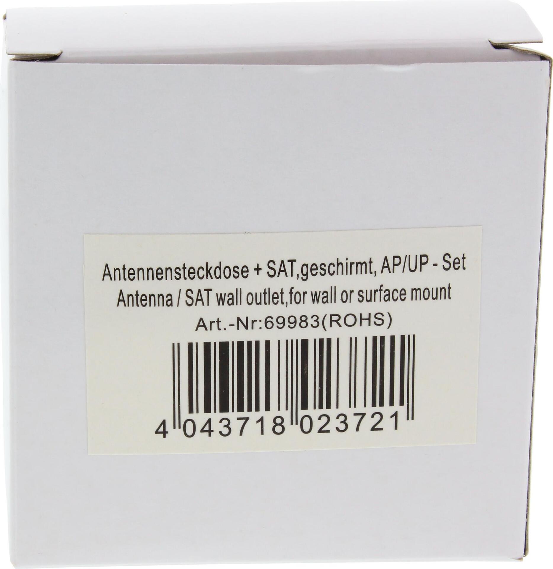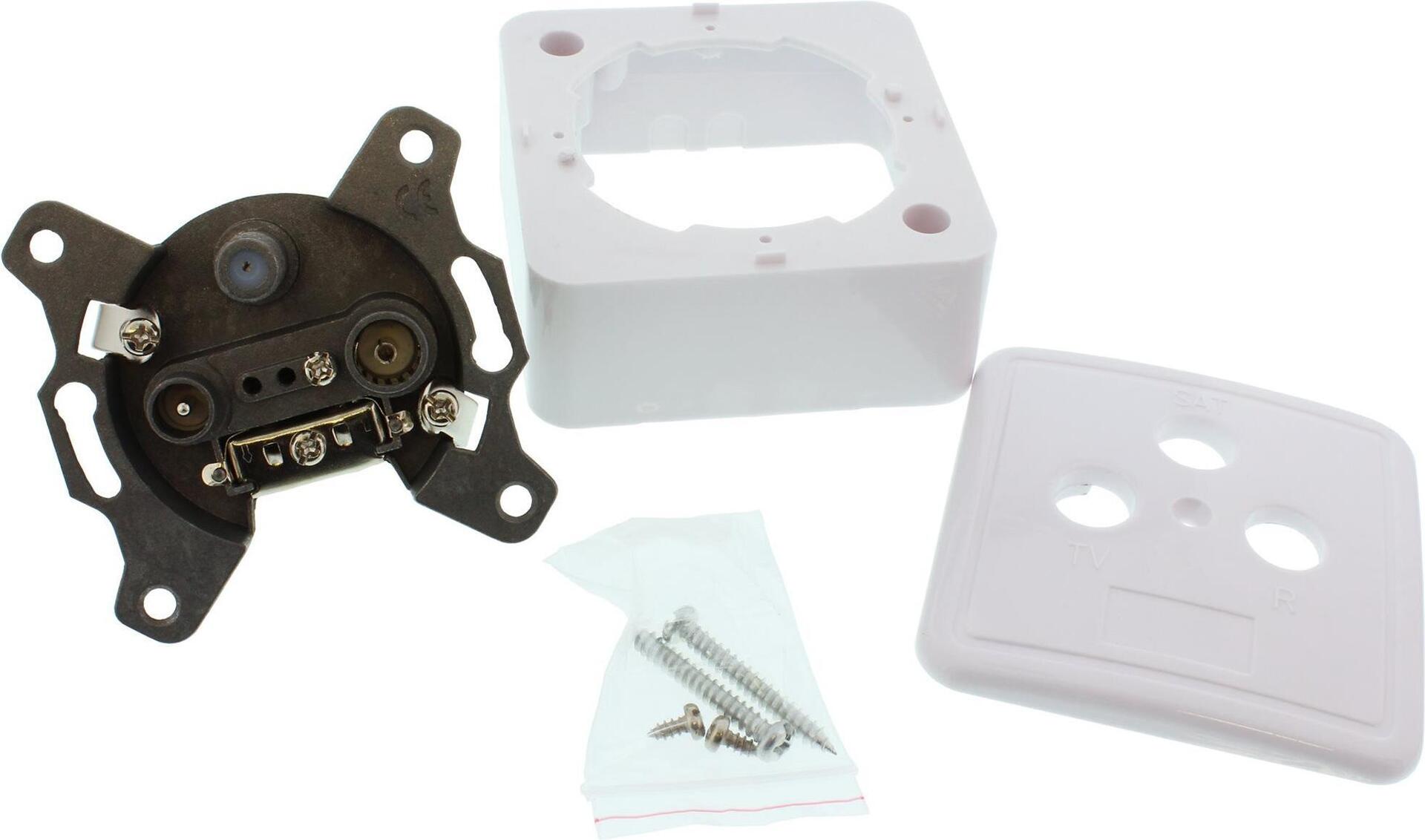 Abgeschirmte Antennensteckdose, Stichdose (keine Durchgangsdose) für BK-, SAT-Anlagen, digitalen Rundfunk, Sonderkanal und Rückkanal tauglich. Montage wahlweise für Aufputz oder Unterputz geeignet.• Geeignet für analoge und digitale SAT-Signale 950-2400MHz, analoge TV Signale 5-860Mhz und analoge und digitale Radiosignale 88-860Mhz• Inkl. BefestigungsschraubenProdukttext[/head]Abgeschirmte Antennensteckdose, Stichdose (keine Durchgangsdose) für BK-, SAT-Anlagen, digitalen Rundfunk, Sonderkanal und Rückkanal tauglich. Montage wahlweise für Aufputz oder Unterputz geeignet.Inkl. Befestigungsschrauben.[head]Hauptmerkmale