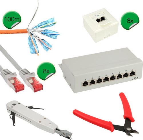Mit diesem InLine® Cat.6 Netzwerk Installations Kit erhalten Sie ein komplettes Set zur Installation eines Cat.6 Netzwerkes. Das Set beinhaltet:• 1x InLine® Verlegekabel Cat.6, 250MHz, S/FTP (PiMf), CU, AWG23, halogenfrei, 100m• 8x InLine® Cat.6 Anschlussdose AP/UP, 2x RJ45 Buchse, RAL9010, weiß, waagrecht• 1x InLine® Patchfeld Cat.6, 8-fach, Desktop, grau• 8x InLine® Patchkabel, S/FTP (PiMf), Cat.6, grau, 3m• 1x InLine® Kabelcutter, für Patchkabel• 1x InLine® LSA Anlegewerkzeug, für Verlegekabel