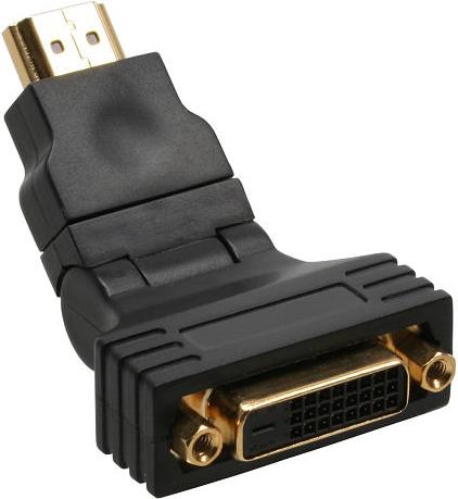 Mit diesem InLine® HDMI-DVI-Adapter können DVI-Videoquellenkabel mit digitalem Signal wie Set-Top-Boxen, DVD-Player, BlueRay, Grafikkarten und andere an Audio-/Videogeräte mit HDMI-Buchse wie Monitore, Projektoren, Digitalfernseher und andere angeschlossen werden. Dieser spezielle HDMI-Adapter ist mittels eines mechanischen Gelenks um bis zu 180° schwenkbar und erleichtert so die Installation in Situationen, in denen der Abstand zwischen Fernseher oder Monitor und der Wand gering ist.• HDMI 19pin Typ-A Buchse auf DVI-D 24+1 Stecker• 180° schwenkbarer Adapter• Unterstützt Single Link Auflösungen (nur digitales Signal)• Unterstützt digitale Audiosignale. Hinweis: Der DVI-Anschluss überträgt in der Regel keine Audiosignale. Nur wenige Grafikchipsätze unterstützen die Ausgabe von Audiosignalen über DVI über ein zusätzliches internes Audiokabel. In diesen Fällen wird die Übertragung von Audiosignalen unterstützt.• Wiederverschließbare Blister-PE-Verpackung mit EAN-CodeProdukttext[/head]Adapter zum Verbinden von DVI Kabeln an den HDMI Anschluss. mit 180° Winkel (oben/unten), perfekt für wenig Platz bei der Wandmontage des Monitor. HDMI Stecker (19pol) an DVI-D Buchse (24+1). Unterstützt nur Digital-Signale.[head]Hauptmerkmale