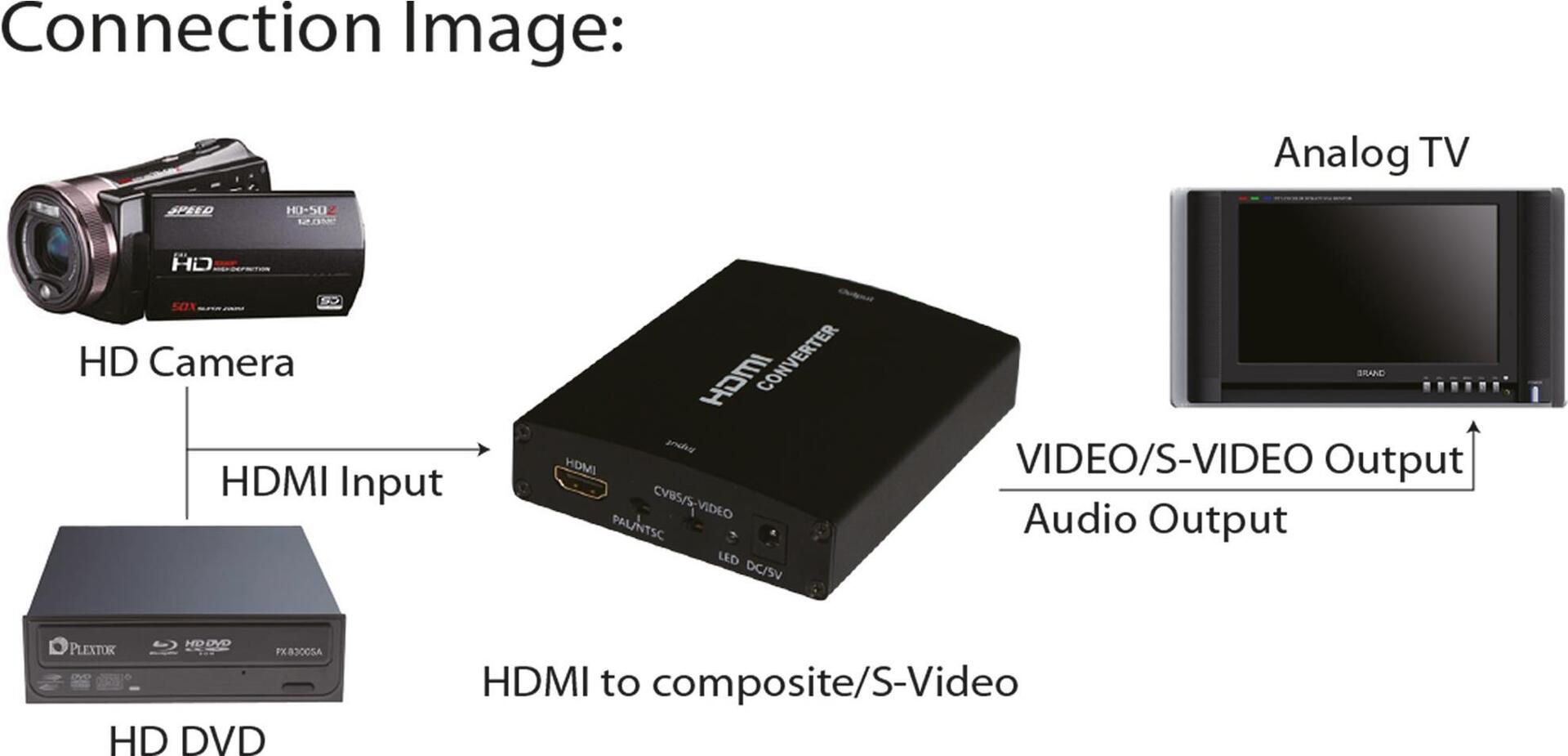 Mit dem HDMI zu Analog Audio-/Videokonverter können Sie digitale HDMI-Signale in analoge Video und Stereo-Audio-Signale konvertieren. HDCP kodierte Signale werden nicht konvertiert.• HDMI-Eingangsauflösung: 480p (60 Hz), 576p (50 Hz), 720p (50 Hz/60 Hz), 1080i (50 Hz/60 Hz), 1080p (50 Hz/60 Hz)• Ausgang: Composite-Video (1,0 Vpp), S-Video (Y: 1,0 Vpp, C: 0,3 Vpp)• Video-Ausgang: PAL/NTSC einstellbar• Video-Ausgangsimpedanz: 75 Ohm• Kompatibel mit HDMI 1.3• Stromversorgung: DC 5V• Betriebstemperatur: -25°C - 75°C• Betriebsluftfeuchtigkeit: 10% - 60%• Maße: 110 x 88 x 25 mm (L x B x H)