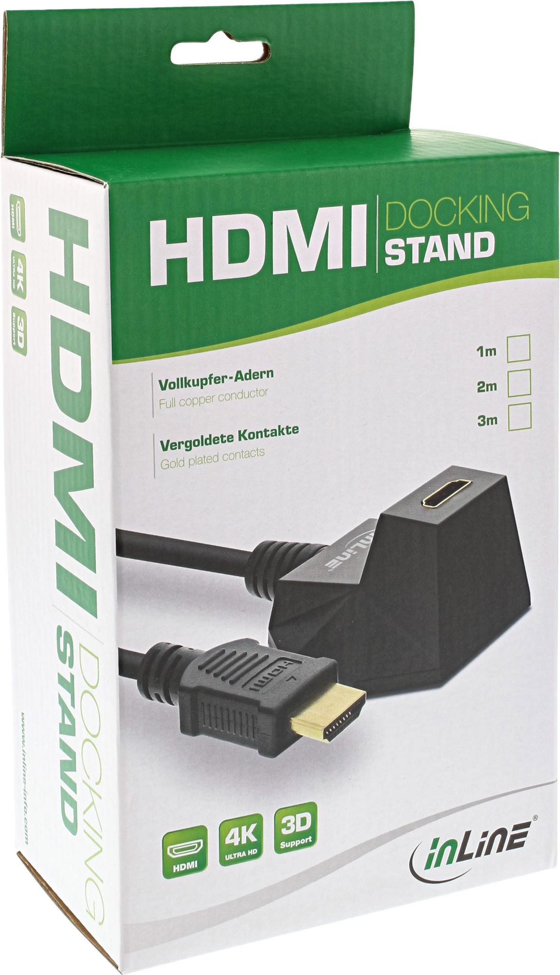 HDMI Verlängerungskabel mit integriertem Standfuß, zum bequemen Betreiben von HDMI Streaming Sticks, wie Fire TV Stick, Chromecast Stick oder ähnliche Sticks mit HDMI Stecker. Ist hinter dem Fernseher an der Wand zu wenig Platz um den HDMI Streaming Stick bequem einzustecken, so kann diese Verlängerung Ihnen helfen. Platzieren Sie den HDMI Standfuß einfach an einem bequem zugänglichen Ort. Der Stick kann somit auch bequem ausgetauscht werden, wenn mehrere Sticks in Betrieb sind und nicht genügend HDMI Anschlüsse am TV frei sind.• HDMI Verlängerung mit Standfuß• HDMI-High Speed mit Ethernet kompatibel• Anschlüsse: HDMI Typ A Buchse im Standfuß auf HDMI Typ A Stecker, 19-polig• Unterstützt alle Auflösungen bis 4K2K, UHD, 2160p @50/60Hz• Signale und Technologien wie 3D, ARC, HFR, CEC werden unterstützt• Vergoldete Kontakte und Vollkupfer-Adern für beste Signalübertragung• Geschirmtes Kabel, Farbe schwarz• Standfuß magnetisch, auch mit Klebe- oder Klettpad zu befestigen, beiliegendHDMI 2.0b:Dieses InLine HDMI-Kabel der Spezifikation 2.0b unterstützt Ultra High Definition (UHD) und 4K-Videoübertragung mit bis zu 60 Bildern pro Sekunde. Das bedeutet eine bessere Bildqualität mit einer breiteren Farbpalette und einem größeren Kontrastumfang im Vergleich zur Vorgängerversion. Damit ist dieses Kabel speziell für die Wiedergabe von hochauflösende Audio- und Videoinhalte mit schnellen Bewegungen geeignet. Das InLine HDMI-Kabel überträgt dabei zuverlässig das Signal von geeigneten HDMI-Quellen wie Kabel- oder Satelliten-Receivern, Streaming-Geräten, Spielekonsolen, Computern und Gaming-PCs, AV-Receivern und Kameras zu passenden HDMI-Ausgabegeräten wie 4k Beamern, UHD Smart-TVs und 4k Gaming-Monitoren.Streaming: Genießen Sie Inhalte von Streaming-Diensten wie Sky, Dazn, Netflix, Amazon Prime Video oder Disney+ über Streaming-Player wie Roku, Amazon Fire TV oder Chromecast in 4k@60Hz. Speziell bei Sportübertragungen oder actionreiche Videos profitieren Sie von einer flüssigeren Wiedergabe und weniger Unschärfeeffekten.Gaming: Verbinden Sie Ihren Gaming-PC oder Spielekonsolen wie Playstation 4 Pro, Xbox One S, Xbox oder One X mit Ihrem Fernseher oder Gaming Monitor für ein flüssigeres und reaktionsschnelleres Spielererlebnis in 4k@60Hz. Über 3D Heimkinosysteme, Gaming-Setups oder spezielle Anwendungen können Sie ein beeindruckendes 3D-Erlebnis genießen.Business: Dieses HDMI-Kabel von InLine ist für professionellen Videobearbeitungsstudios, Multimedia-Setups oder professionellen Audio-/Videoinstallationen geeignet. Bei Live-Streams, der Arbeit mit computergestütztem Design (CAD) oder Animationen kann eine höhere Bildwiederholfrequenz die Genauigkeit und Flüssigkeit der Darstellung verbessern.Vergoldete KontakteDie vergoldeten Stecker verbessern die Leitfähigkeit, Haltbarkeit und Korrosionsbeständigkeit des InLine HDMI-Kabels. Die Gefahr von Oxidation oder Korrosion ist deutlich geringer. Das erhöht langfristig die Zuverlässigkeit der Verbindung, z. B. auch in Umgebungen mit einer höheren Luftfeuchtigkeit. Vergoldete Kontakte passen sich den Anschlüssen bessern an und sind weniger anfällig für Abrieb und Beschädigung beim Ein- und Ausstecken. Das verlängert die Lebensdauer insbesondere bei häufigem Gebrauch oder starker Beanspruchung, Außerdem kann die höhere Leitfähigkeit speziell bei längeren Kabelstrecken die Signalübertragung und somit die Bild- und Tonqualität verbessern.Produkttext[/head]HDMI Verlängerungskabel mit integriertem Standfuß, zum bequemen Betreiben von HDMI Streaming Sticks, wie Fire TV Stick, Chromecast Stick oder ähnliche Sticks mit HDMI Stecker. Ist hinter dem Fernseher an der Wand zu wenig Platz um den HDMI Streaming Stick bequem einzustecken, so kann diese Verlängerung Ihnen helfen. Plazieren Sie den HDMI Standfuß einfach an einem bequem zugänglichen Ort. Der Stick kann somit auch bequem ausgetauscht werden, wenn mehrere Sticks in Betrieb sind und nicht genügend HDMI Anschlüsse am TV frei sind.HDMI Verlängerung mit Standfuß.HDMI-High Speed mit Ethernet kompatibel.Anschlüsse: HDMI Typ A Buchse im Standfuß auf HDMI Typ A Stecker, 19-polig.Unterstützt alle Auflösungen bis 4K2K, UHD, 2160p @50/60Hz.Signale und Technologien wie 3D, ARC, HFR, CEC werden unterstützt.Vergoldete Kontakte und Vollkupfer-Adern für beste Signalübertragung.Geschirmtes Kabel, Farbe schwarz.Standfuß magnetisch, auch mit Klebe- oder Klettpad zu befestigen, beiliegend.[head]Hauptmerkmale