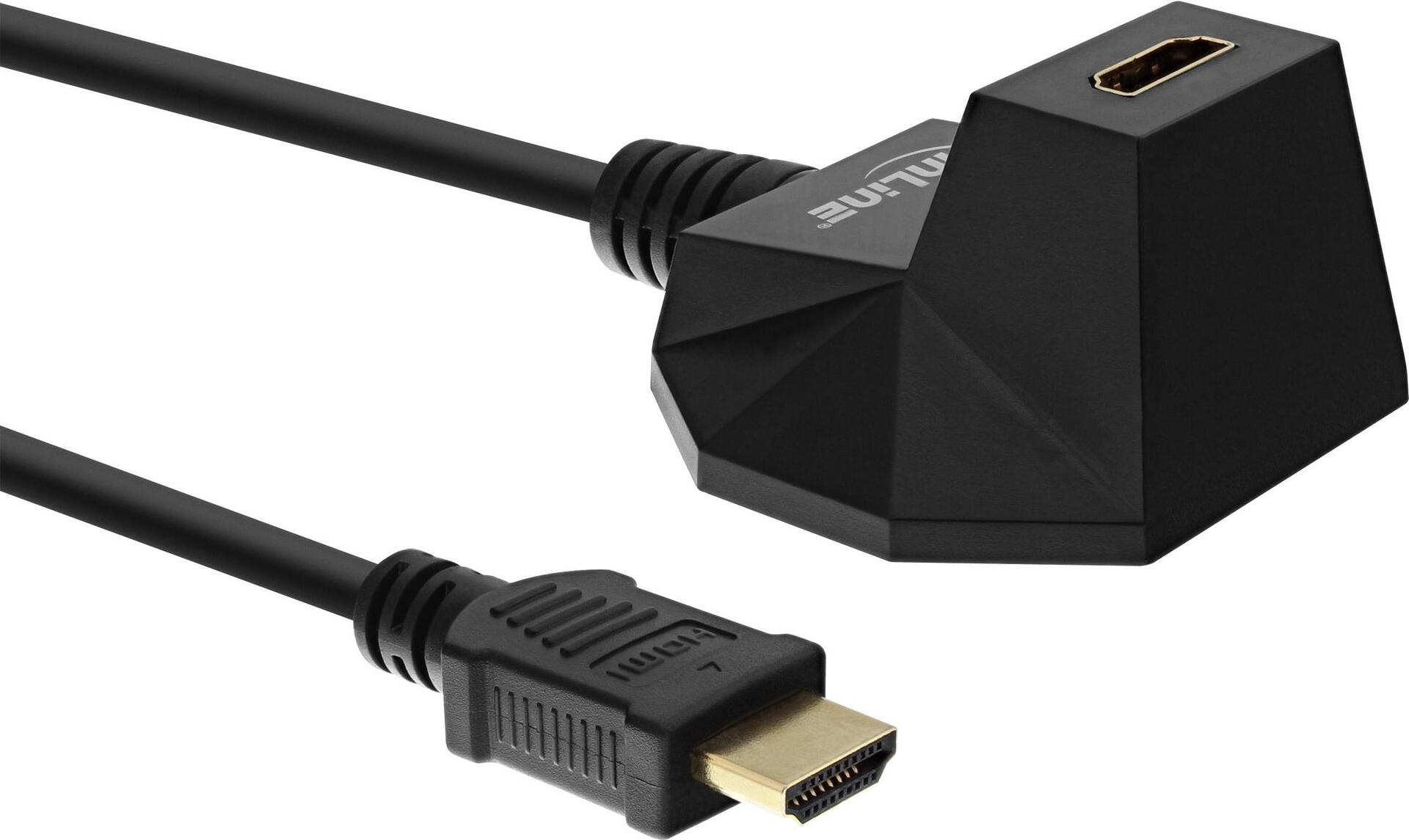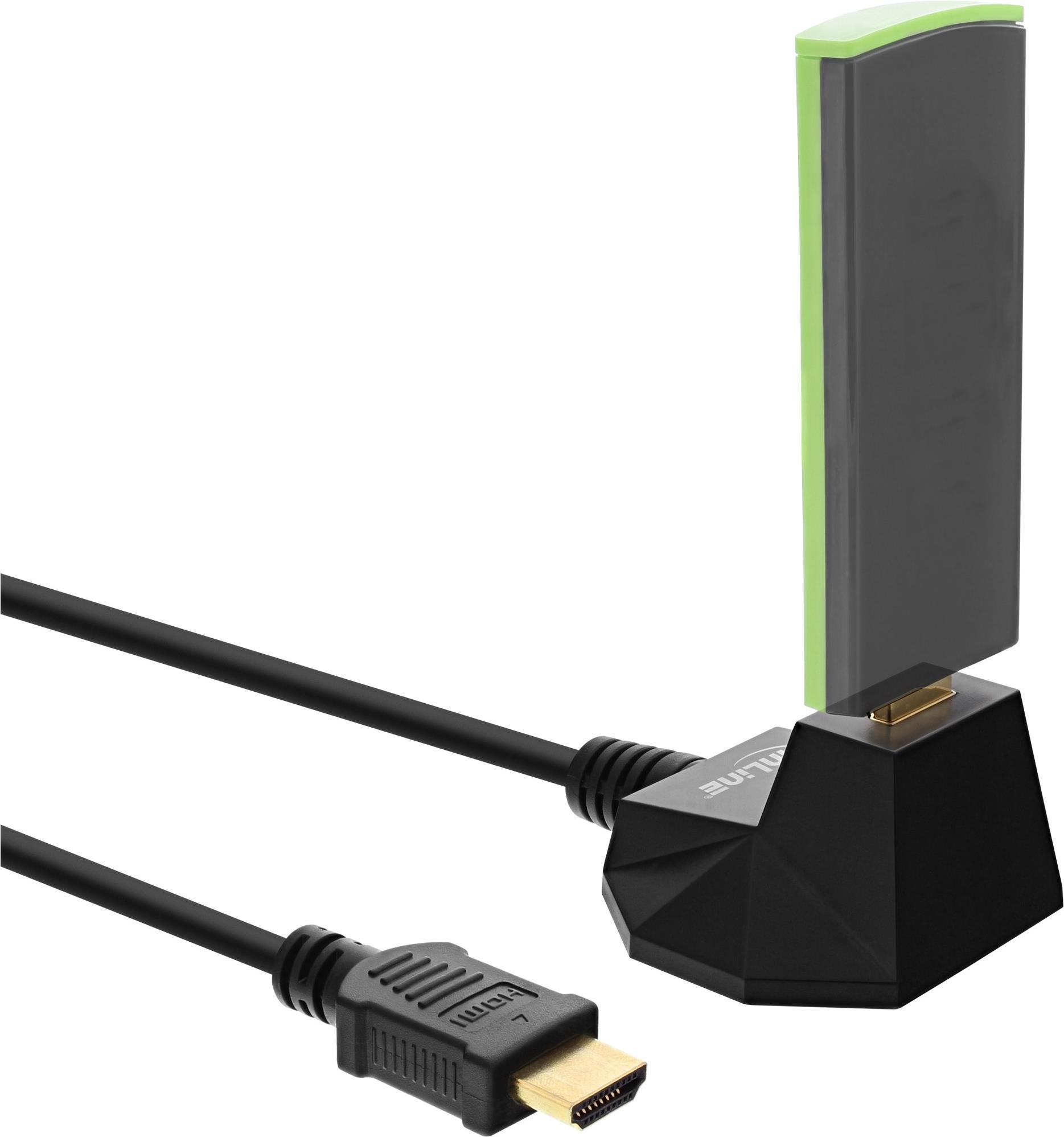HDMI Verlängerungskabel mit integriertem Standfuß, zum bequemen Betreiben von HDMI Streaming Sticks, wie Fire TV Stick, Chromecast Stick oder ähnliche Sticks mit HDMI Stecker. Ist hinter dem Fernseher an der Wand zu wenig Platz um den HDMI Streaming Stick bequem einzustecken, so kann diese Verlängerung Ihnen helfen. Platzieren Sie den HDMI Standfuß einfach an einem bequem zugänglichen Ort. Der Stick kann somit auch bequem ausgetauscht werden, wenn mehrere Sticks in Betrieb sind und nicht genügend HDMI Anschlüsse am TV frei sind.• HDMI Verlängerung mit Standfuß• HDMI-High Speed mit Ethernet kompatibel• Anschlüsse: HDMI Typ A Buchse im Standfuß auf HDMI Typ A Stecker, 19-polig• Unterstützt alle Auflösungen bis 4K2K, UHD, 2160p @50/60Hz• Signale und Technologien wie 3D, ARC, HFR, CEC werden unterstützt• Vergoldete Kontakte und Vollkupfer-Adern für beste Signalübertragung• Geschirmtes Kabel, Farbe schwarz• Standfuß magnetisch, auch mit Klebe- oder Klettpad zu befestigen, beiliegendHDMI 2.0b:Dieses InLine HDMI-Kabel der Spezifikation 2.0b unterstützt Ultra High Definition (UHD) und 4K-Videoübertragung mit bis zu 60 Bildern pro Sekunde. Das bedeutet eine bessere Bildqualität mit einer breiteren Farbpalette und einem größeren Kontrastumfang im Vergleich zur Vorgängerversion. Damit ist dieses Kabel speziell für die Wiedergabe von hochauflösende Audio- und Videoinhalte mit schnellen Bewegungen geeignet. Das InLine HDMI-Kabel überträgt dabei zuverlässig das Signal von geeigneten HDMI-Quellen wie Kabel- oder Satelliten-Receivern, Streaming-Geräten, Spielekonsolen, Computern und Gaming-PCs, AV-Receivern und Kameras zu passenden HDMI-Ausgabegeräten wie 4k Beamern, UHD Smart-TVs und 4k Gaming-Monitoren.Streaming: Genießen Sie Inhalte von Streaming-Diensten wie Sky, Dazn, Netflix, Amazon Prime Video oder Disney+ über Streaming-Player wie Roku, Amazon Fire TV oder Chromecast in 4k@60Hz. Speziell bei Sportübertragungen oder actionreiche Videos profitieren Sie von einer flüssigeren Wiedergabe und weniger Unschärfeeffekten.Gaming: Verbinden Sie Ihren Gaming-PC oder Spielekonsolen wie Playstation 4 Pro, Xbox One S, Xbox oder One X mit Ihrem Fernseher oder Gaming Monitor für ein flüssigeres und reaktionsschnelleres Spielererlebnis in 4k@60Hz. Über 3D Heimkinosysteme, Gaming-Setups oder spezielle Anwendungen können Sie ein beeindruckendes 3D-Erlebnis genießen.Business: Dieses HDMI-Kabel von InLine ist für professionellen Videobearbeitungsstudios, Multimedia-Setups oder professionellen Audio-/Videoinstallationen geeignet. Bei Live-Streams, der Arbeit mit computergestütztem Design (CAD) oder Animationen kann eine höhere Bildwiederholfrequenz die Genauigkeit und Flüssigkeit der Darstellung verbessern.Vergoldete KontakteDie vergoldeten Stecker verbessern die Leitfähigkeit, Haltbarkeit und Korrosionsbeständigkeit des InLine HDMI-Kabels. Die Gefahr von Oxidation oder Korrosion ist deutlich geringer. Das erhöht langfristig die Zuverlässigkeit der Verbindung, z. B. auch in Umgebungen mit einer höheren Luftfeuchtigkeit. Vergoldete Kontakte passen sich den Anschlüssen bessern an und sind weniger anfällig für Abrieb und Beschädigung beim Ein- und Ausstecken. Das verlängert die Lebensdauer insbesondere bei häufigem Gebrauch oder starker Beanspruchung, Außerdem kann die höhere Leitfähigkeit speziell bei längeren Kabelstrecken die Signalübertragung und somit die Bild- und Tonqualität verbessern.Produkttext[/head]HDMI Verlängerungskabel mit integriertem Standfuß, zum bequemen Betreiben von HDMI Streaming Sticks, wie Fire TV Stick, Chromecast Stick oder ähnliche Sticks mit HDMI Stecker. Ist hinter dem Fernseher an der Wand zu wenig Platz um den HDMI Streaming Stick bequem einzustecken, so kann diese Verlängerung Ihnen helfen. Plazieren Sie den HDMI Standfuß einfach an einem bequem zugänglichen Ort. Der Stick kann somit auch bequem ausgetauscht werden, wenn mehrere Sticks in Betrieb sind und nicht genügend HDMI Anschlüsse am TV frei sind.HDMI Verlängerung mit StandfußHDMI-High Speed mit Ethernet kompatibelAnschlüsse: HDMI Typ A Buchse im Standfuß auf HDMI Typ A Stecker, 19-poligUnterstützt alle Auflösungen bis 4K2K, UHD, 2160p @50/60HzSignale und Technologien wie 3D, ARC, HFR, CEC werden unterstütztVergoldete Kontakte und Vollkupfer-Adern für beste SignalübertragungGeschirmtes Kabel, Farbe schwarzStandfuß magnetisch, auch mit Klebe- oder Klettpad zu befestigen, beiliegend[head]Hauptmerkmale