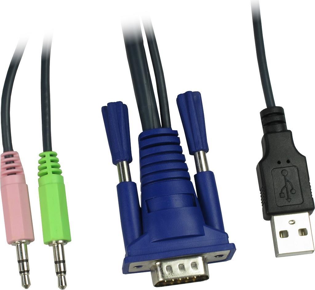 Der Anschluss des KVM erfolgt per USB (Tastatur/Maus), 2 x 3,5 mm Klinke (Audio Mic/Line) und DB15 VGA Monitor über die 2 mitgelieferten Anschlusskabel, an die Computer.