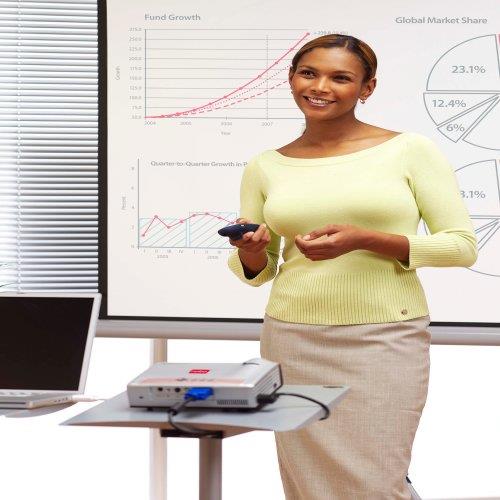 Flexible Projektionsleinwände mit Dreibeinstativ. Die brillante mattweiße Oberfläche mit schwarzem Rand gewährleistet scharfe und detailreiche Bilder, die für alle Anwesenden klar erkennbar sind. Die Leinwand kann problemlos in die Hülle eingezogen werden, um Beschädigung zu verhindern. Projektionsfläche 170 × 127,5 cm.