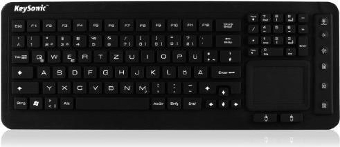 Ergonomisch gestaltete Silikonummantelte-Tastatur mit 98 Tasten und Multi-Finger Touchpad. Die Keysonic Tastatur verfügt über ein ausgezeichnetes, taktiles Druckgefühl und ist wasserdicht nach IP68 und kann somit sogar in Flüssigkeiten eingetaucht werden.Das integrierte Touchpad ermöglicht den Einsatz der Keysonic Tastatur ohne externe, zusätzliche Maus. Dies ist sowohl ein Kosten- als auch ein praktischer Vorteil, das Touchpad lässt sich sowohl mit als auch ohne Gummihandschuhe einwandfrei bedienen.