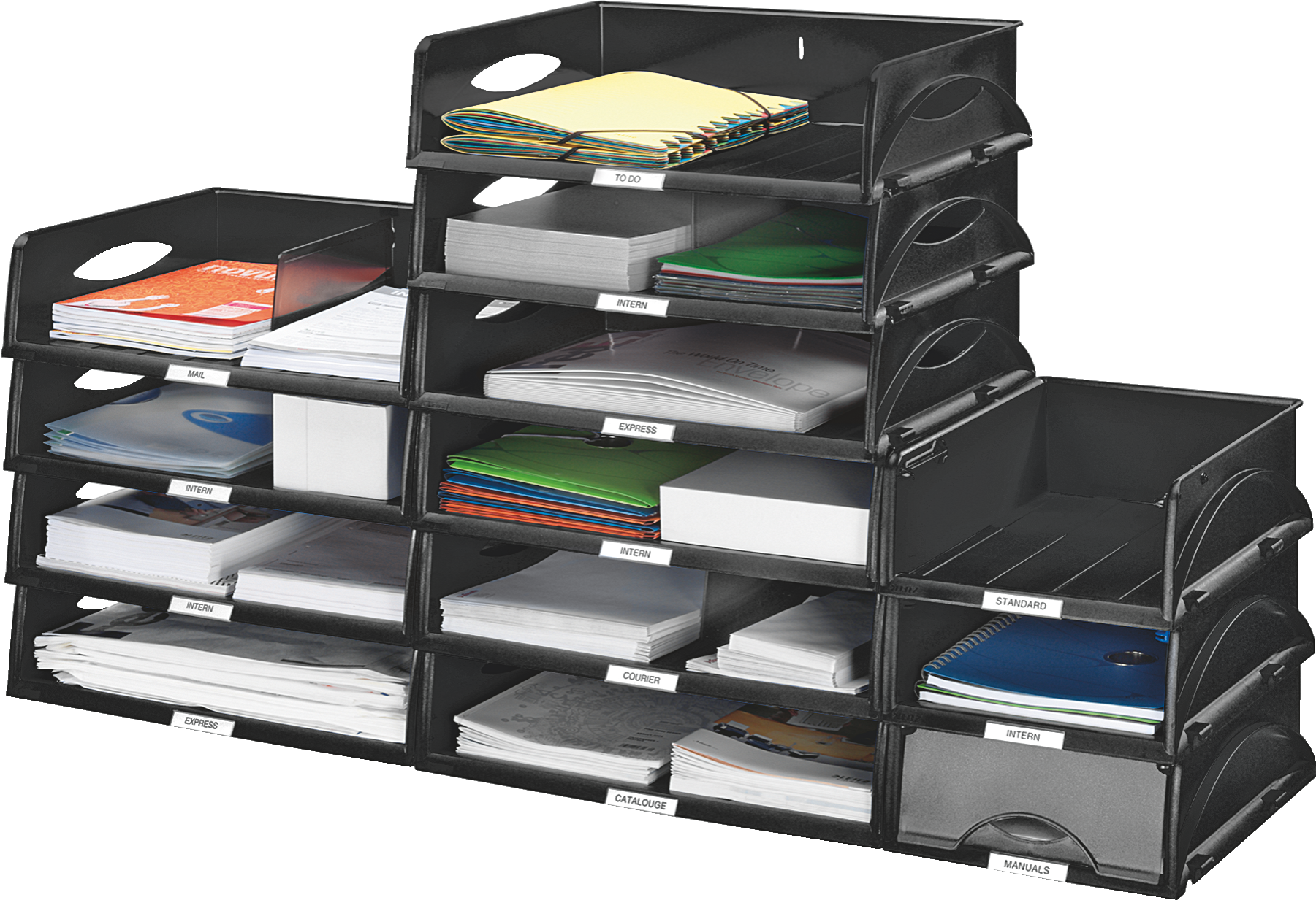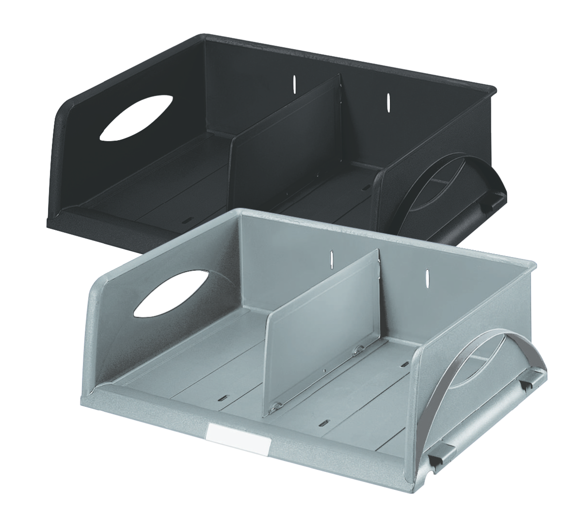 Modulares Sortier- und Ablagesystem bestehend aus großformatigen Ablagekörben. Ideal für die Verwendung in Poststellen, Kopierräumen, Lagern und Empfangsbereichen.