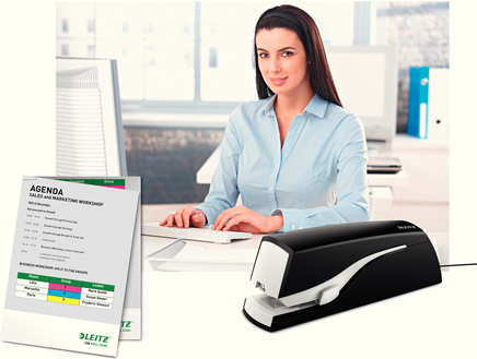 Schnelle, einfache Bedienung. Zum besseren Schutz muss das Heftgerät nicht berührt werden, so ist hygienisches Heften durch kontaktlosen Gebrauch möglich. Hohe Leistungsfähigkeit. Durch die Flachhefttechnologie wird die Heftklammer komplett flach geschlossen, das spart bis zu 30% Platz im Ordner. Heften ohne Klammerstau mit den Leitz e2 Heftklammern.