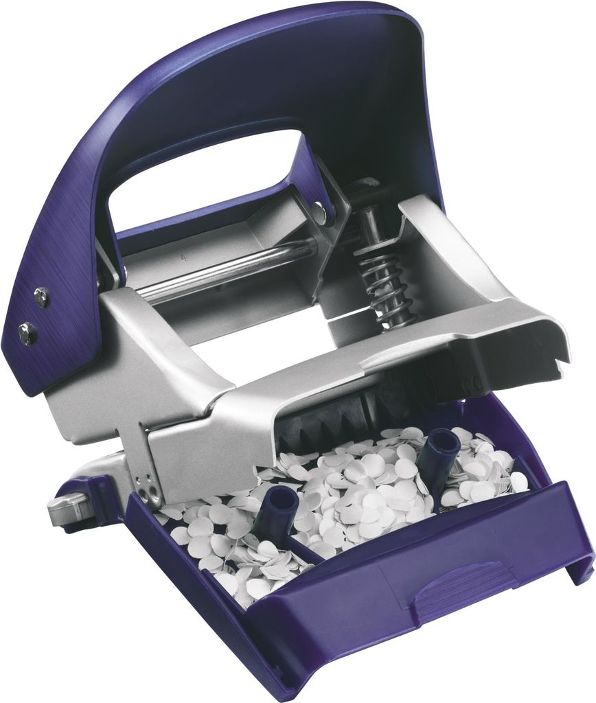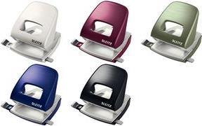 Auffallender Metalllocher für den täglichen Gebrauch. Modernes, gebürstetes Oberflächendesign und stylische Farben. Locher mit patentierter, ergonomischer Griffmulde und ultra-scharfen Lochstempeln für weniger Kraftaufwand.
