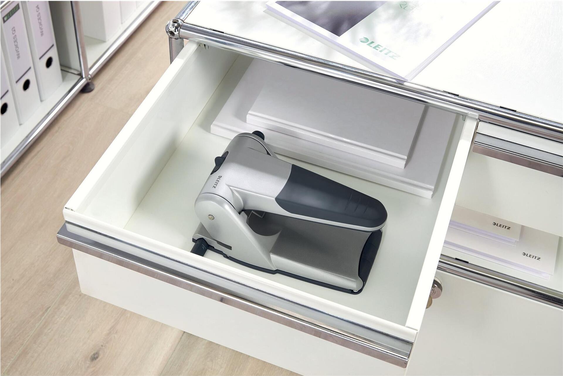 Hochwertiger, extrastarker Locher mit zweifach Lochung für müheloses Lochen von bis zu 65 Blatt Papier (80 g/m ). Dieser robuste und langlebige Locher verfügt über einen rutschfesten Griff und eine sichere Anschlagschiene mit einfach zu lesenden Markierungen bis zum Format A3, um ein reibungsloses und präzises Lochen zu gewährleisten. Das Entleeren des Lochers ist dank des aufklappbaren Abfallbehälters einfach und sauber, und der Griff lässt sich zur platzsparenden Aufbewahrung verriegeln. Dieser Hochleistungslocher ist für eine lange Nutzungsdauer bestimmt und besteht hauptsächlich aus Aluminiumdruckguss mit einem kleinen Anteil an recycelten Post-Consumer-Kunststoffteilen. Er kann dank verfügbarer Ersatzteile repariert werden, um die Lebensdauer zu verlängern. Am Ende seiner Lebensdauer ist er zu 100 % recycelbar, wenn er vollständig in die verschiedenen Materialtypen zerlegt wird, um Abfall zu reduzieren und die Ressourcen der Erde zu schonen. Der Leitz 5180 Heavy-duty Locher hat eine Garantie von 10 Jahren und ist GS-geprüft. Zusätzlich bieten wir Ihnen passende Produkte für Ihren Bedarf an Hochleistungs-Heft- und Lochgeräten an.