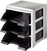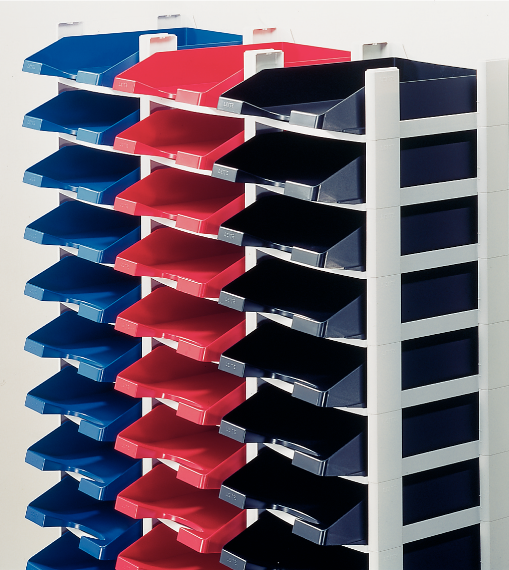 Stabiles und flexibles Ablagesystem. Bestehend aus 3 Plus Briefkörben Standard mit Stapelmodulen und oberer Abschlussplatte. Ausbaufähig mit weiteren Stapelmodulen.