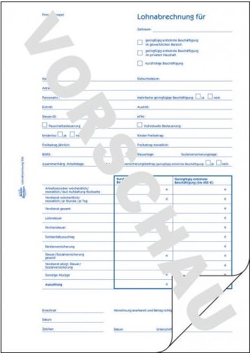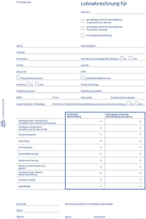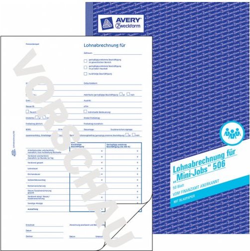 Die Lohnabrechnung für geringfügig oder kurzfristig Beschäftigte (Minijob) 506 von AVERY ZWECKFORM im DIN A4 Format wird vom Finanzamt anerkannt. Die 50 Minijob Lohnabrechnungen sind 2-seitig bedruckt und sind inklusive ...