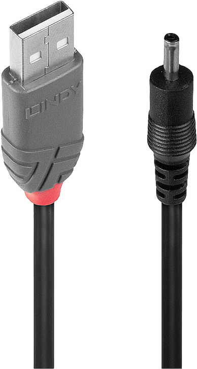 USB Typ A Stecker an DC-Stecker (3.5mm Außen-/1.35mm Innendurchmesser).