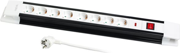 Steckdosenleiste mit 8 Buchsen von LogiLink. Beleuchteter Ein- und Ausschalter. Buchsen mit Kindersicherung. Kabellänge 3 Meter. - 8 Buchsen (deutsche Art) - Mit EIN/AUS Schalter, beleuchtet - abgewinkelter stecker - Mit Kindersicherung - Leistung: 250V/16A, 50Hz, max. 3500Watt - Kabel Spezifikation: H05VV-F 3G 1,5 mm2 - Kabellänge: 3 m