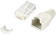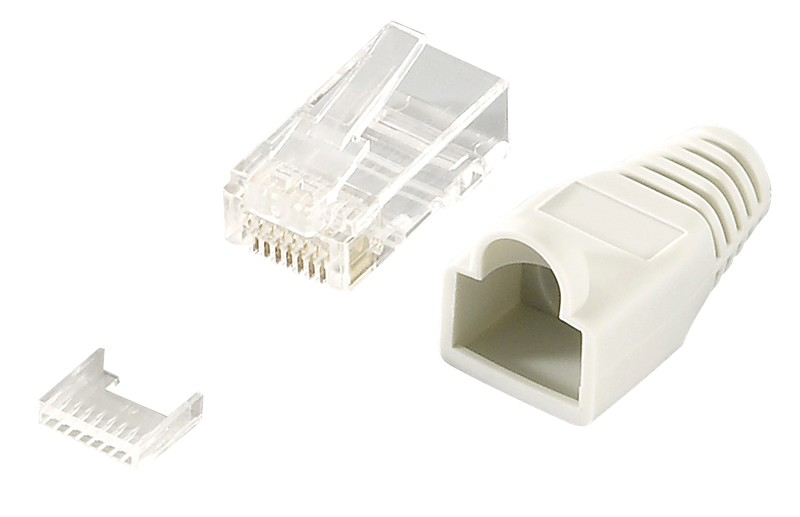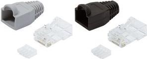 Modularer RJ45 Steckverbinder zur Konfektion von ungeschirmten Patchkabeln. Der Artikel (1 Stück) besteht aus 100 Steckern, 100 Knickschutztüllen und 100 Einfädelkämmen.