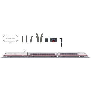 H0 Start-Set \"\"ICE 2\"\" der DB AGInterCity Express Baureihe 402 der Deutschen Bahn AG (DB AG). Dreiteilige Zuggarnitur: Triebkopf, Großraumwagen 1. Klasse und Steuerwagen 2. Klasse.Technische Daten: Altersklasse: ab 15 JahreAntrieb: Auf 2 AchsenBauart (Modellbahn): TriebzugBaugröße: H0Beleuchtung: LichtwechselGleis-System: H0 Märklin C-Gleis (mit Bettung)Haftreifen: JaHerst.-Teilenr.: 29792LüP / LüK: 762 mmMotor (Modellbahn): SpezialmotorStrom-System: Digital AC SoundLieferumfang: 1 Triebkopf1 Großraumwagen 1. Klasse1 Steuerwagen 2. Klasse14 Gebogene Gleise18 Gerade Gleise1 Weiche links1 Weiche links1 Gleisanschlussbox1 Schaltnetzteil1 Mobile Station.