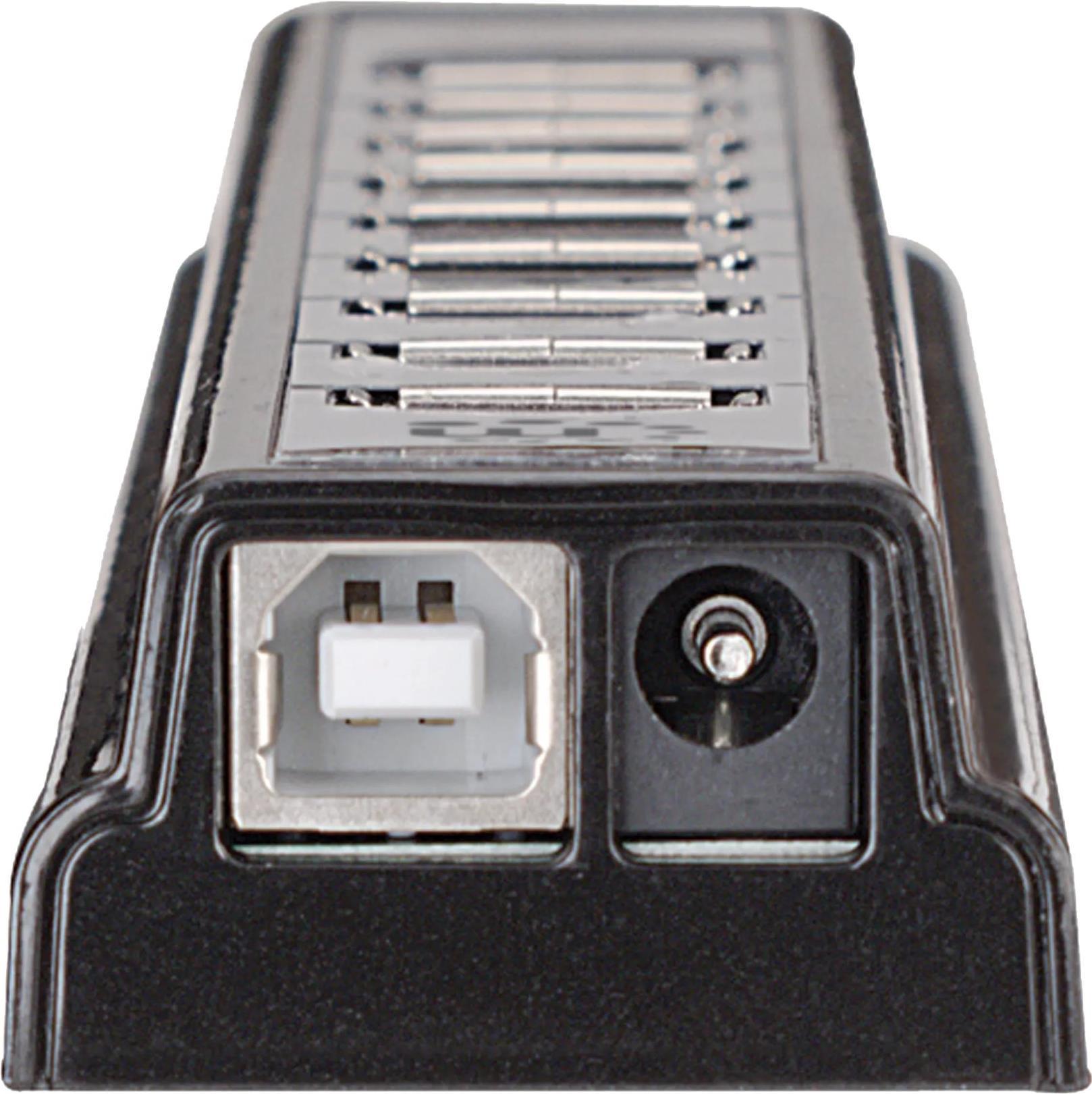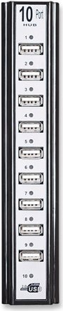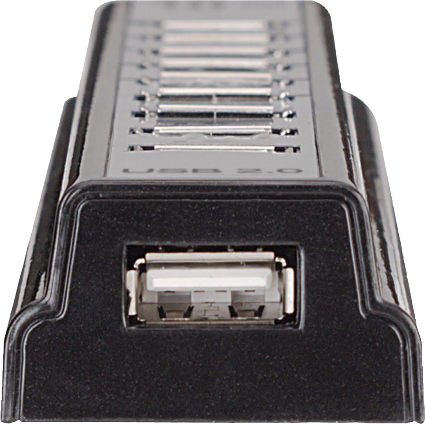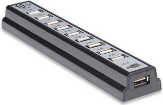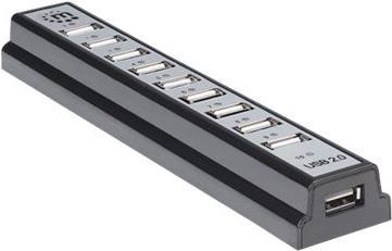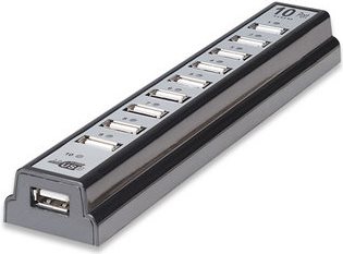 Dieser Manhattan Hi-Speed USB 2.0 Desktop Hub erweitert PCs und Notebooks um 10 abwärtskompatible USB-2.0-Ports und deckt damit den hohen Bedarf an USB-Ports heutiger computeraffiner Nutzer: Sei es zur Aufladung von Handys oder zum Anschluss von Tastatur, Maus, Webcam, Flash-Laufwerken, Card Readern und mehr. Das kompakte, robuste Kunststoffgehäuse bringt alle Anschlüsse seitlich statt auf der Oberseite unter und reduziert so das Kabelgewirr deutlich. Plug&Play, Hot-Swap-Fähigkeit, Windows- und Mac-Kompatibilität sowie Übertragungsgeschwindigkeiten bis zu 480 Mbit/s runden diese umfangreiche USB-Lösung ab.