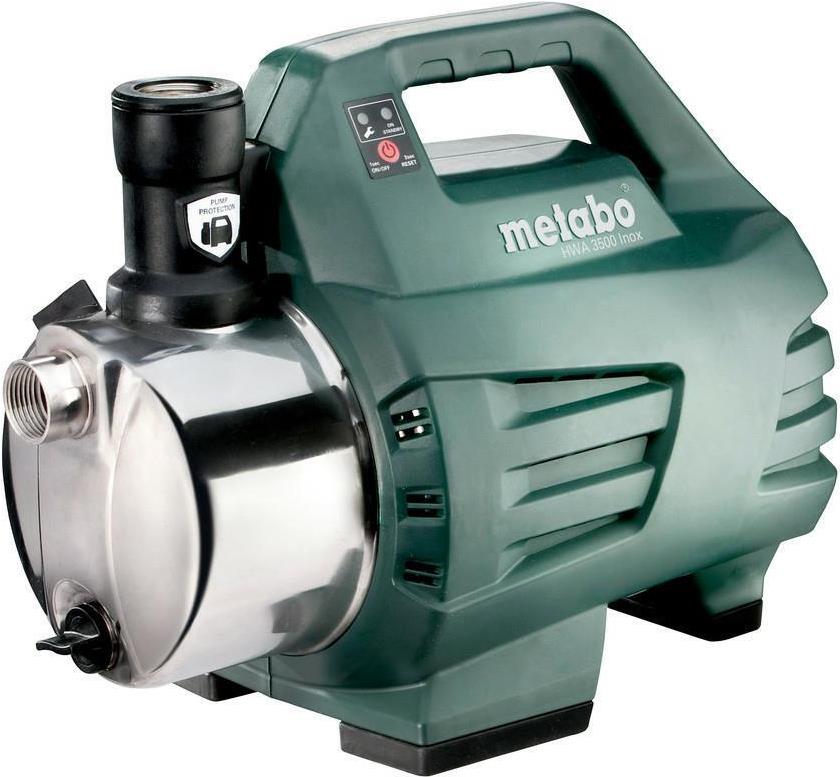 Hauswasserautomat HWA 3500 InoxMax. Fördermenge 3500 l/hMax. Förderhöhe 45 mFür die automatische Wasserversorgung, zur Gartenbewässerung, Grundwasserförderung sowie zum Fördern, Auspumpen und Umwälzen von Klarwasser. Intelligente Elektronik für bedarfsgerechten und energiesparenden Automatikbetrieb. Metabo Pump Protection: automatischer Trockenlaufschutz mit LED-Anzeige zum Schutz der Pumpe und für hohe Anwendersicherheit. Separate Wasser-Einfüllöffnung für komfortable Inbetriebnahme der Pumpe. Werkzeuglose Wasser-Ablassschraube zum Schutz bei Frostgefahr.Ausstattung: Wartungsfreier KondensatormotorÜberlastschutzGleitringdichtungssystem für lange LebensdauerEdelstahl-Pumpengehäuse.Technische Daten: Betriebsspannung: 230 V/50 HzDruckanschluss: 30,3 mm (1\"\") IGFörderhöhe (max.): 45 mFördermenge (max.): 3500 l/hKabellänge: 1,5 mLeistungsaufnahme (P1): 1100 WSauganschluss: 30,3 mm (1\"\") IGSelbstansaugend bis: 8 m