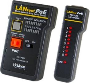 LANtest PoE ist ein neu gestaltetes und sehr praktisches Testgerät, das sehr einfach die richtige Pin-Belegung von 10Base-T- und 10Base-2-Kabeln, RJ45/RJ11 Modularkabeln, 258A, TIA-568A/568B, Token-Ring-Kabeln u.v.m. auslesen kann, indem es die Sendeseite mit der entsprechenden Empfangsseite vergleicht. Mit dem Remote-Set können auch weiter entfernt installierte Kabel in Wänden oder unter Abdeckplatten getestet werden.