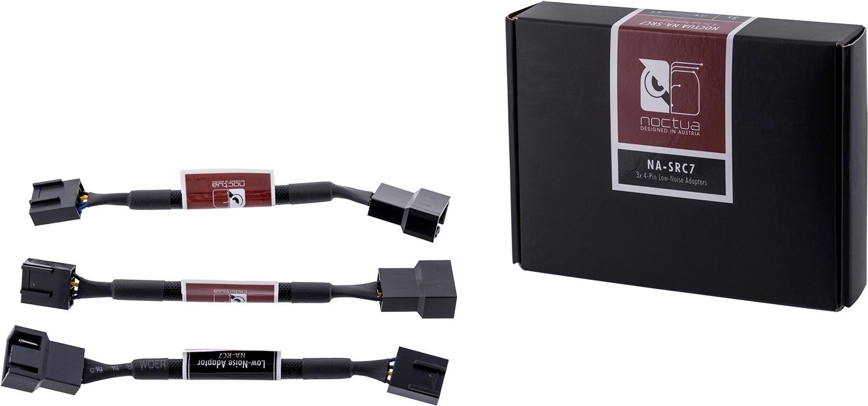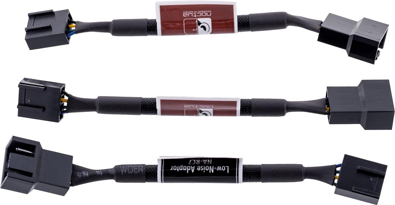 Das NA-SRC7 ist ein Zubehör-Set für Lüfter, das drei komplett ummantelte NA-RC7 Low-Noise Adapter (LNA) für Noctua 4-pin PWM Lüfter umfasst. Zwischen den Lüfter und die Stromquelle geschalten, reduzieren die Adapter dessen Geschwindigkeit und Lärmemission.