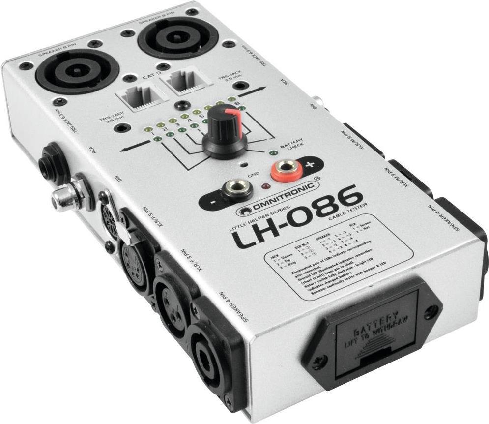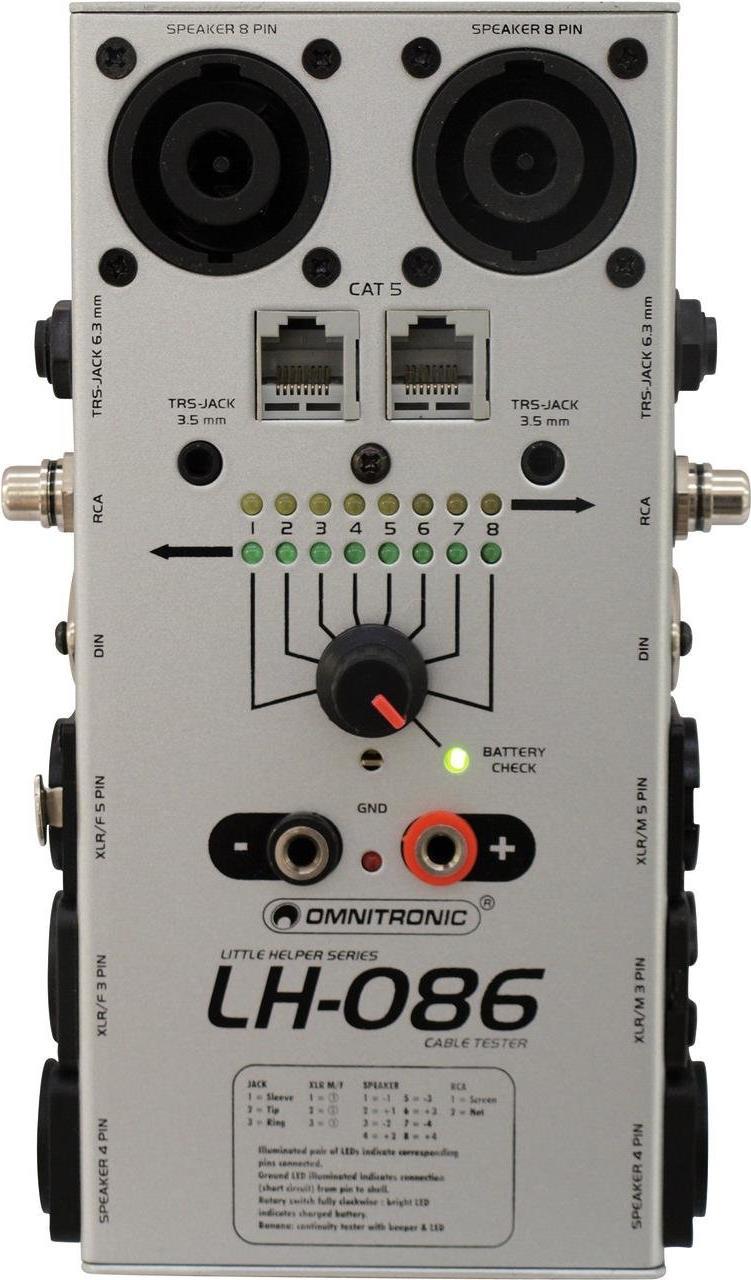 Omnitronic LH-086 KabeltesterUniversal-Kabeltester für Showtechnic-AnwendungenUniversal-Kabeltester für Showtechnic-AnwendungenIdealer Kabeltester für alle Kabelverbindungen im Studio- und Live-BetriebPrüft 3+5-pol. XLR-, 3,5/6,3-mm-Klinken- (auch Stereo), CAT5, DIN-, Cinch- und 4+8-pol Speaker-Kabel und SteckverbindungenAnzeige der Polarität bzw. vorhandener KurzschlüsseKomfortable Auswahl über DrehschalterTest des Durchgangssignals außerdem über zwei Bananenbuchsen, an die Mess-Spitzen für Diodentest angeschlossen werden können. Eine LED sowie ein Pieper sprechen im Falle eines Durchgangssignals an.Unverzichtbarer Helfer für Musiker und TechnikerSpannungsversorgung über 9-V-BlockbatterieTechnische Daten: Gewicht: 1.0 kgProduktabmessung, Breite: 215 mmProduktabmessung, Höhe: 70 mmWeitere technische Daten: Spannungsversorgung: 1 Standard 9 V BlockMaße (LxBxH): 190 x 112 x 60 mmGewicht: 0,8 kg