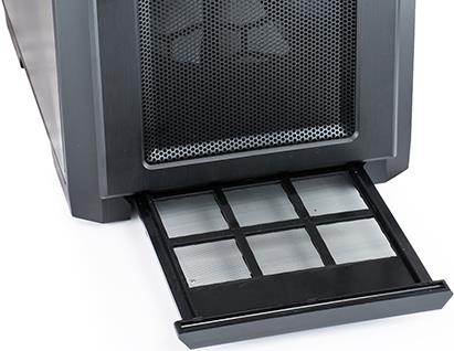 | Kühlsystem | Vorderseite : 200 mm Lüfter x 1 / 1200 U/min / 82,1 CFM / 19 dB / 2 120-/140-mm-Lüfter werden unterstützt Oberseite : 120/140 mm Lüfterhalterung x 3 / Unterstützung für 1 200-mm-Lüfter Rückseite : 120/140 mm Lüfterhalterung x 1 Unten : 120 mm Lüfterhalterung x 2 / Unterstützung für 1 140-mm-Lüfter Intern : 120 mm Lüfterhalterung x 2 |