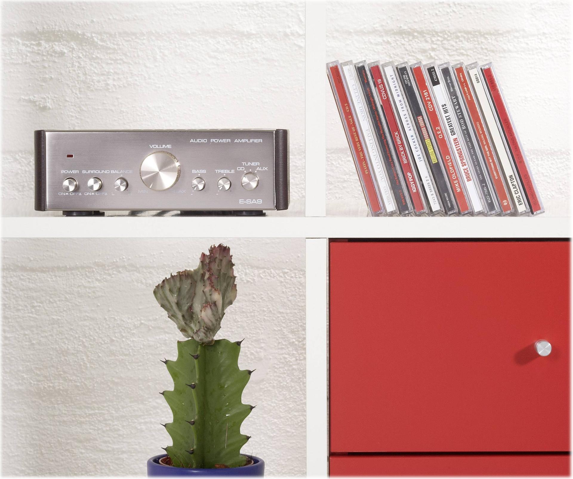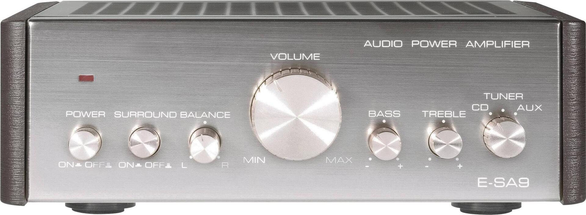 Als edel designtes Schmuckstück präsentiert sich dieser Hi-Fi-Mini-Verstärker mit Seitenteilen in Holzoptik. Damit auch der gute Klang nicht zu kurz kommt, stehen Eingänge für CD, Tuner und Tape zur Verfügung. Getrennte Regler für Bässe und Höhen ermöglichen die optimale Anpassung an die angeschlossenen Boxen. Damit ist dieses kleine Kraftbündel ideal für viele Anwendungsbereiche: ob als Zentrale Ihrer Heimanlage, als Zweitverstärker oder im Gästezimmer - der E-SA9M klingt so gut, wie er aussieht!