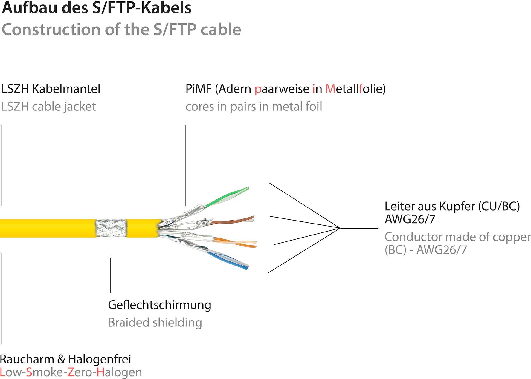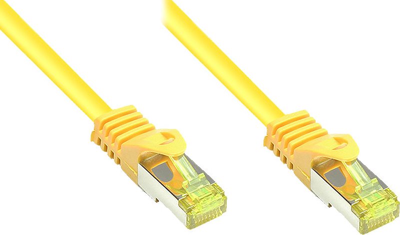 • RJ45 Patchkabel mitCat.7 Rohkabel und Rastnasenschutz (RNS®), S/FTP, PiMF, halogenfrei, 600MHz, OFC, gelb, 15m, Good Connections® (8070R-150Y)
